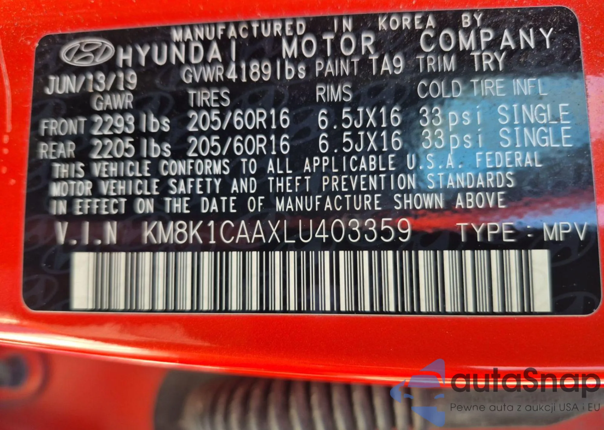 • VIN KM8K1CAAXLU403359