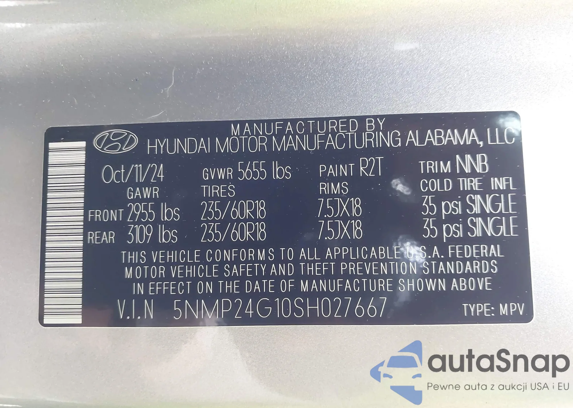 LOT: 43424054 VIN: 5NMP24G10SH027667