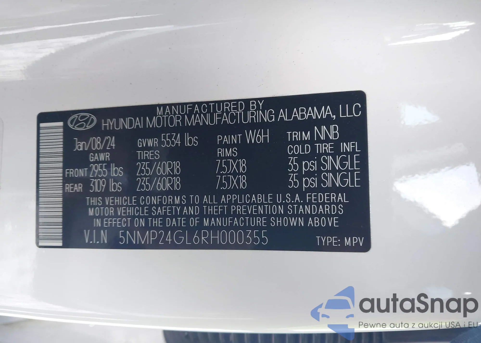 LOT: 43818287 VIN: 5NMP24GL6RH000355