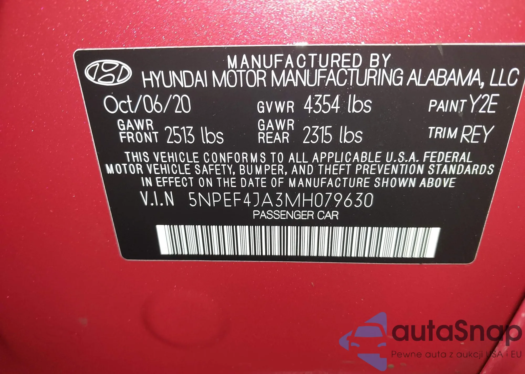 LOT: 43941980 VIN: 5NPEF4JA6MH078374
