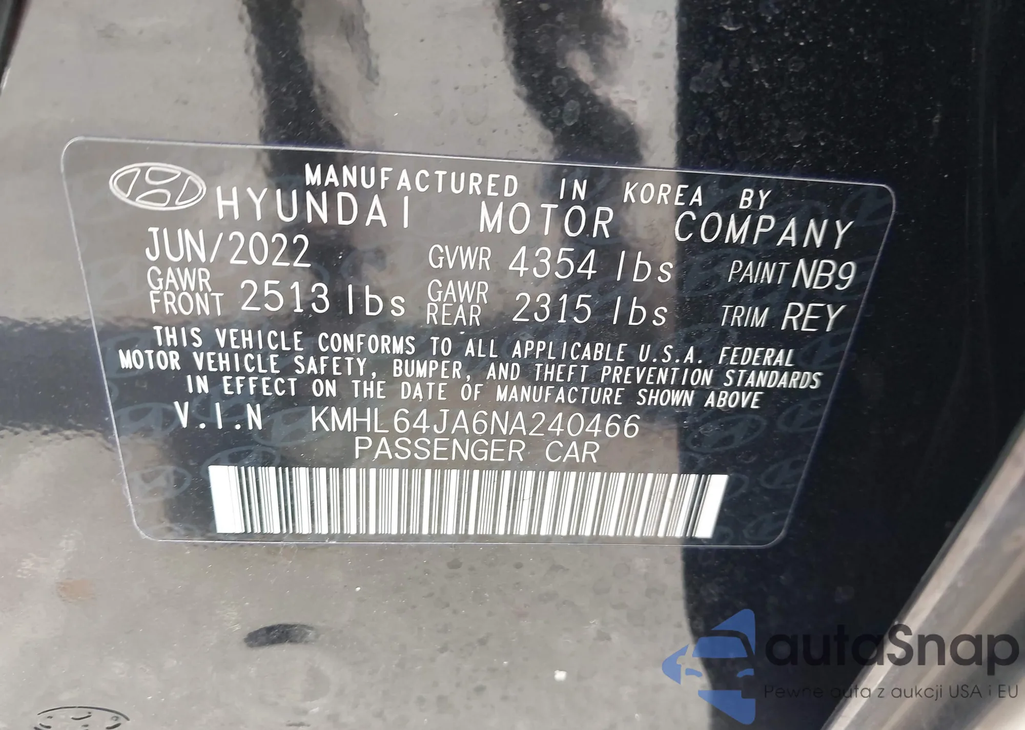LOT: 43956797 VIN: KMHL64JA6NA240466