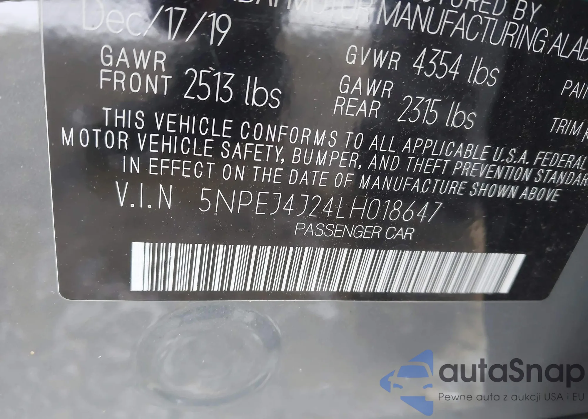 LOT: 43835201 VIN: 5NPEJ4J24LH018647