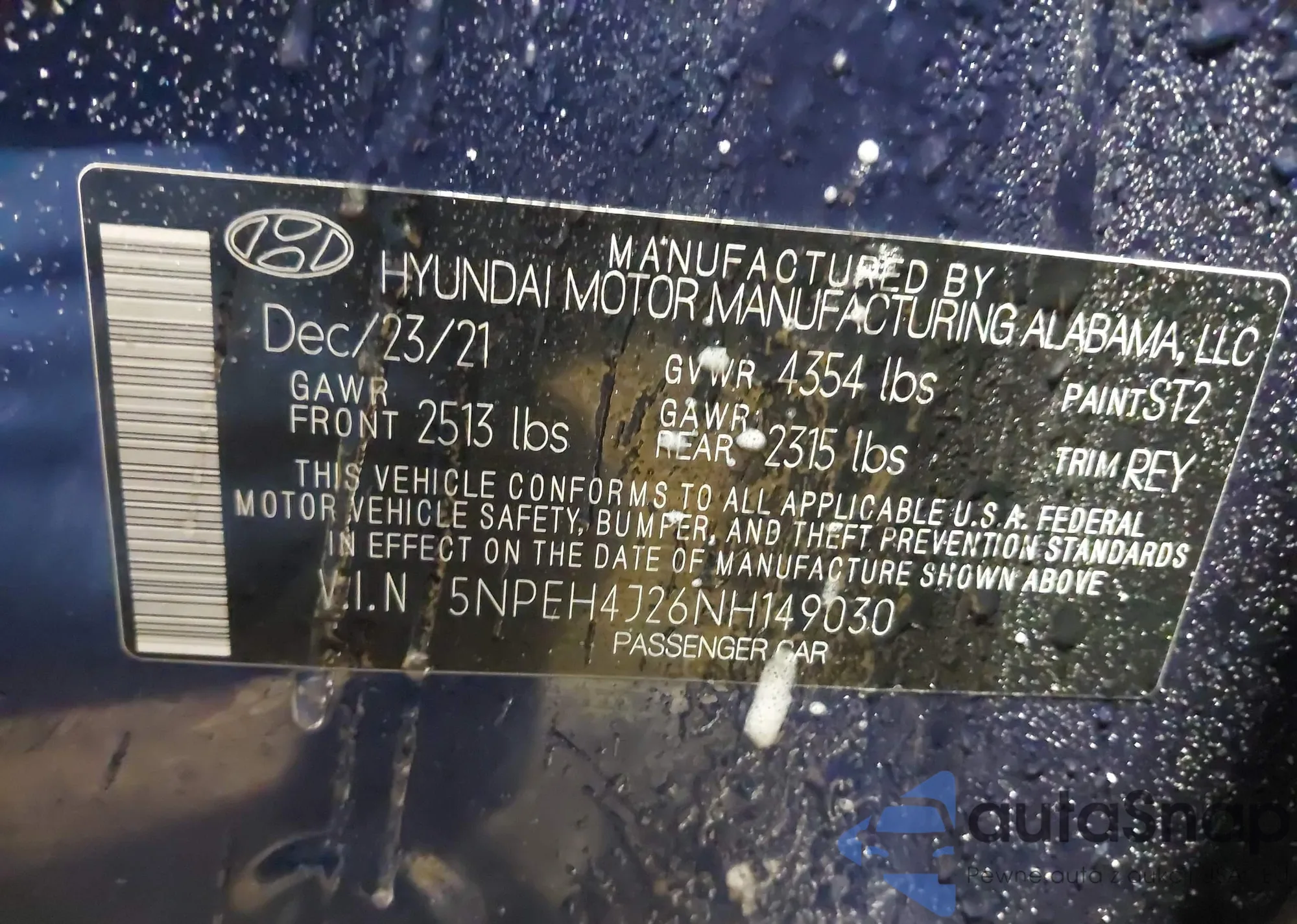 LOT: 44195514 VIN: 5NPEH4J26NH149030