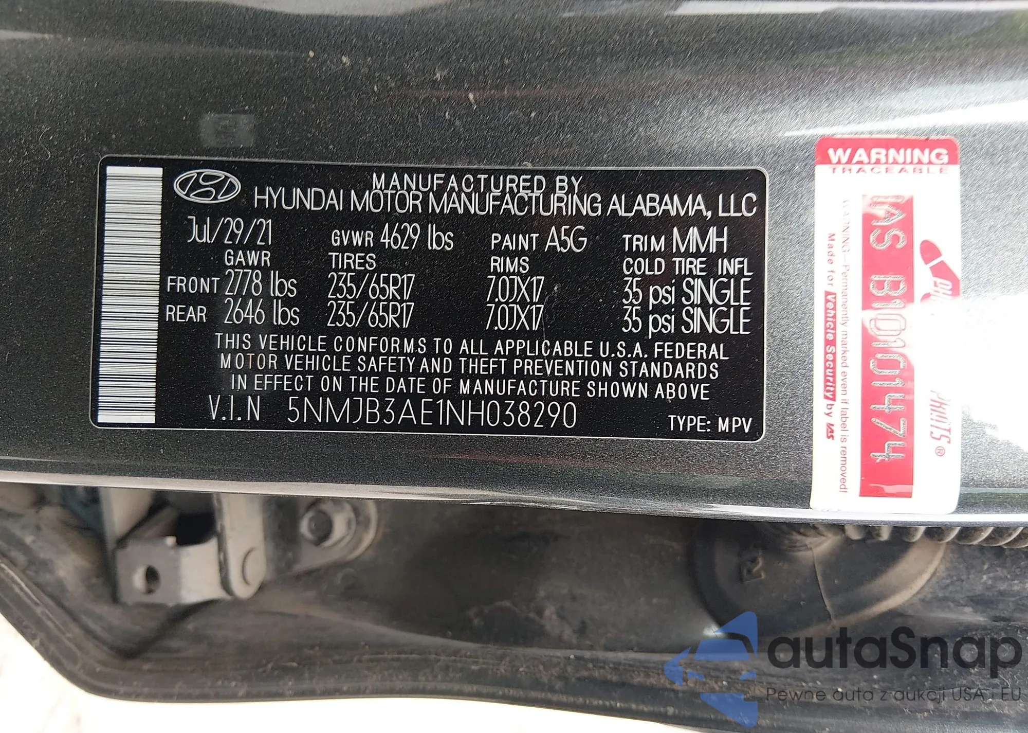 • VIN 5NMJB3AE1NH038290