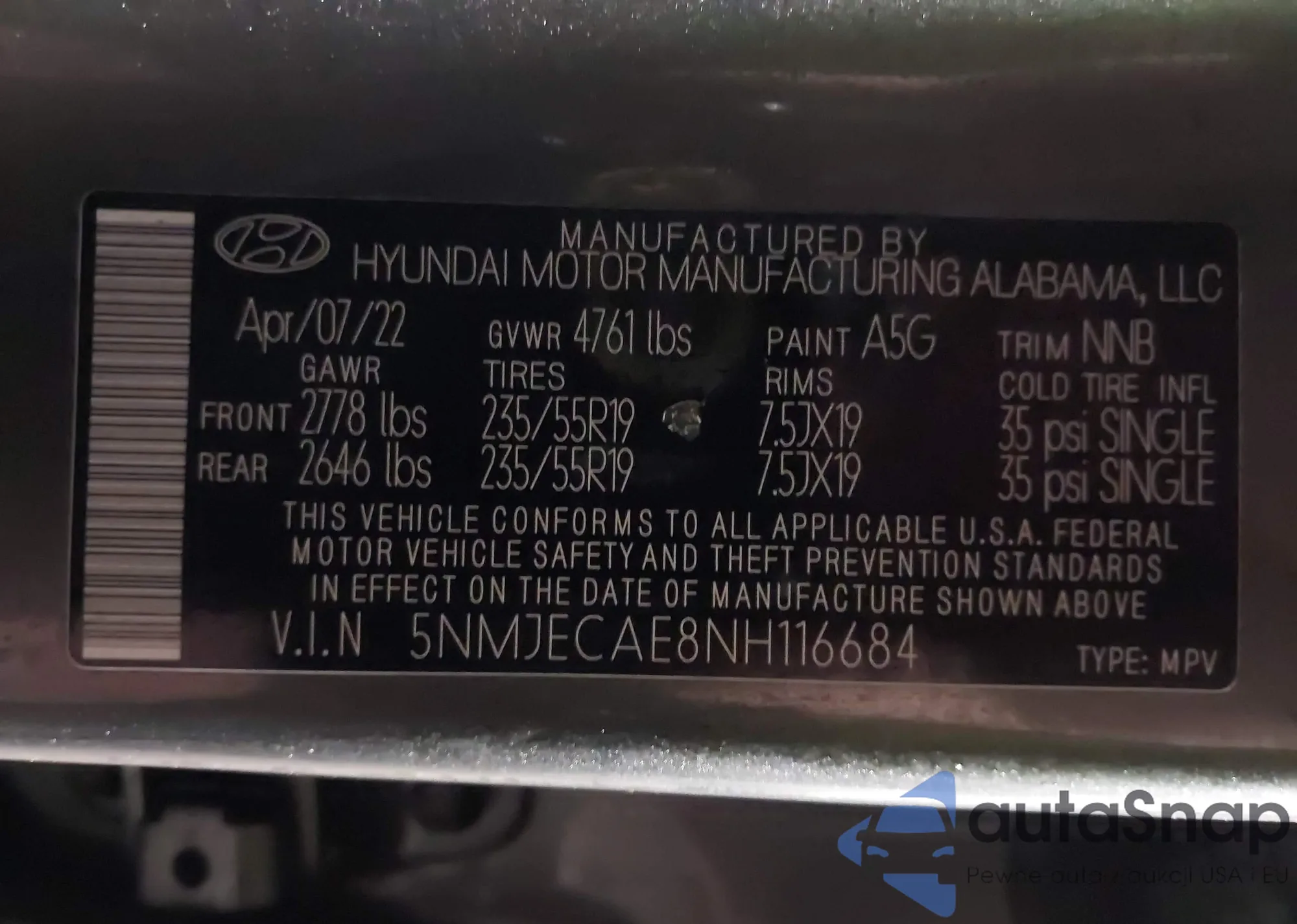 • VIN 5NMJECAE8NH116684