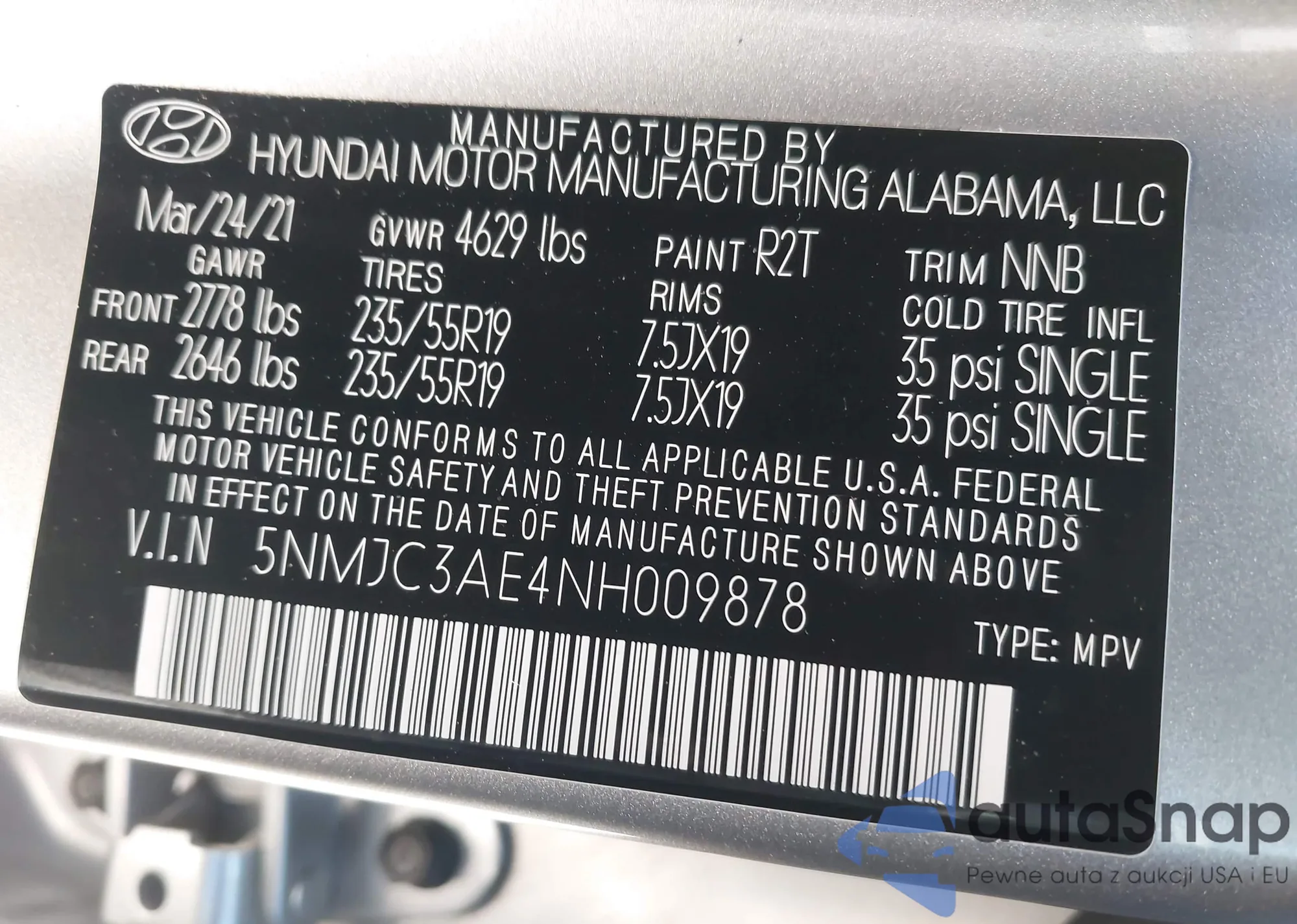 • VIN 5NMJC3AE4NH009878