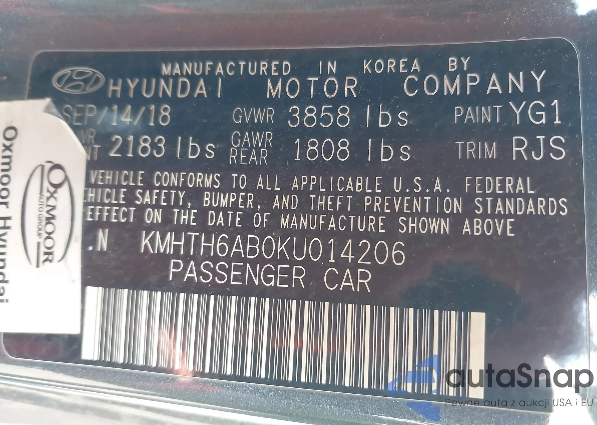 LOT: 44394228 VIN: KMHTG6AF3KU005327