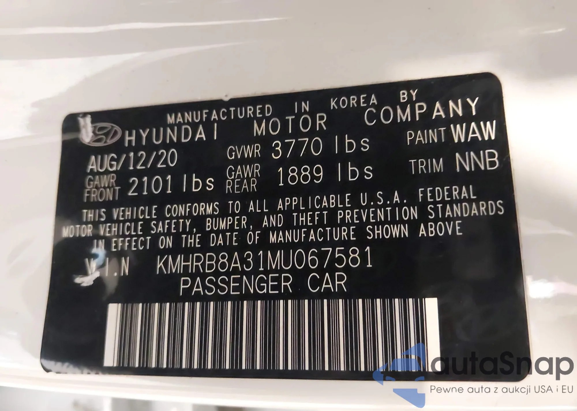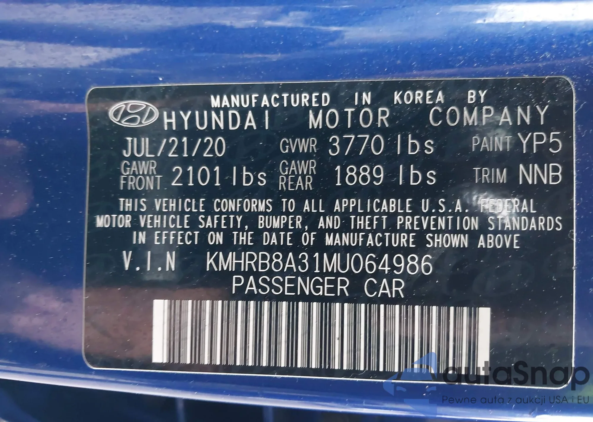 LOT: 44319946 VIN: KMHRB8A31MU067581
