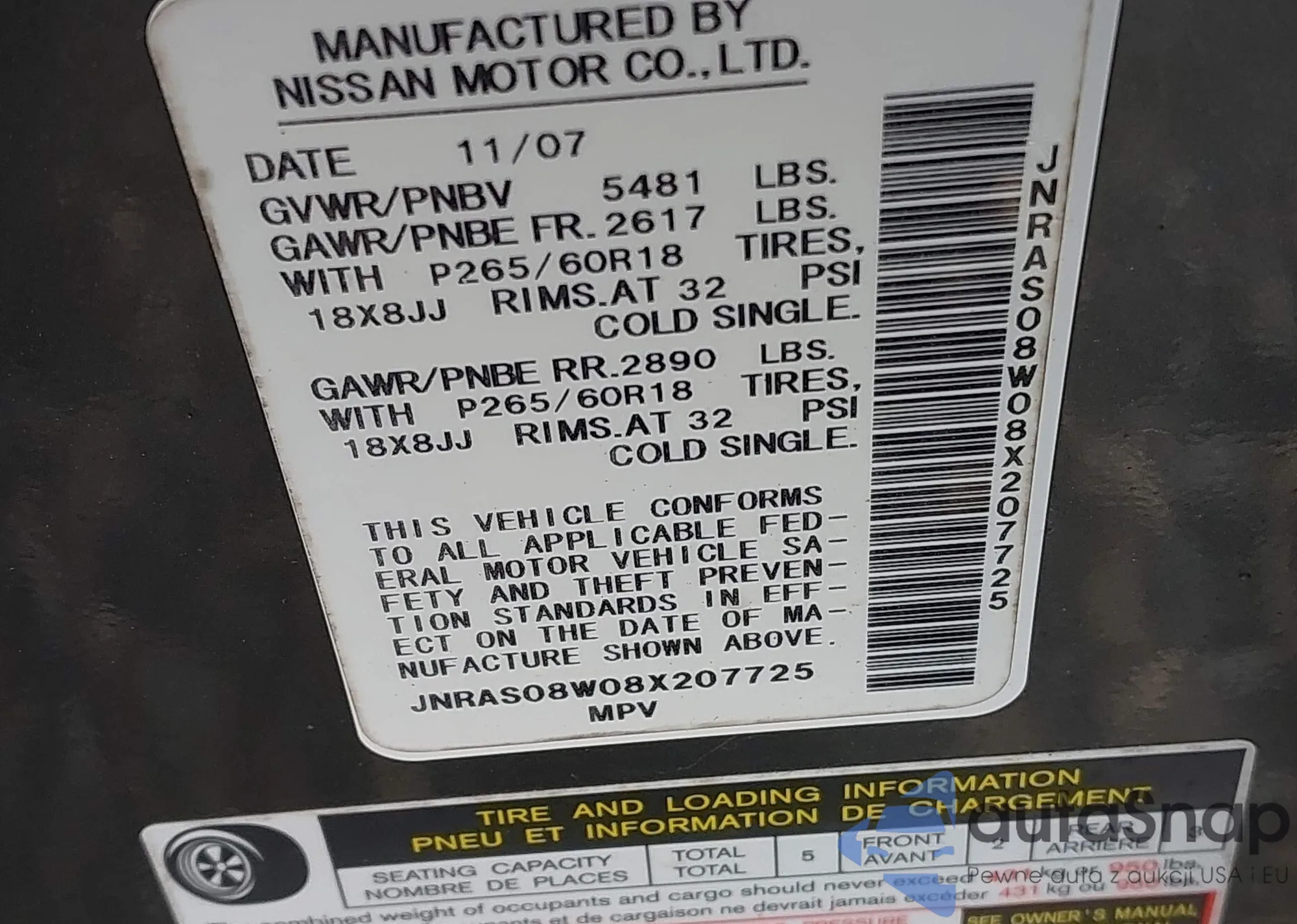 LOT: 82656725 VIN: JNRAS18W59M151712