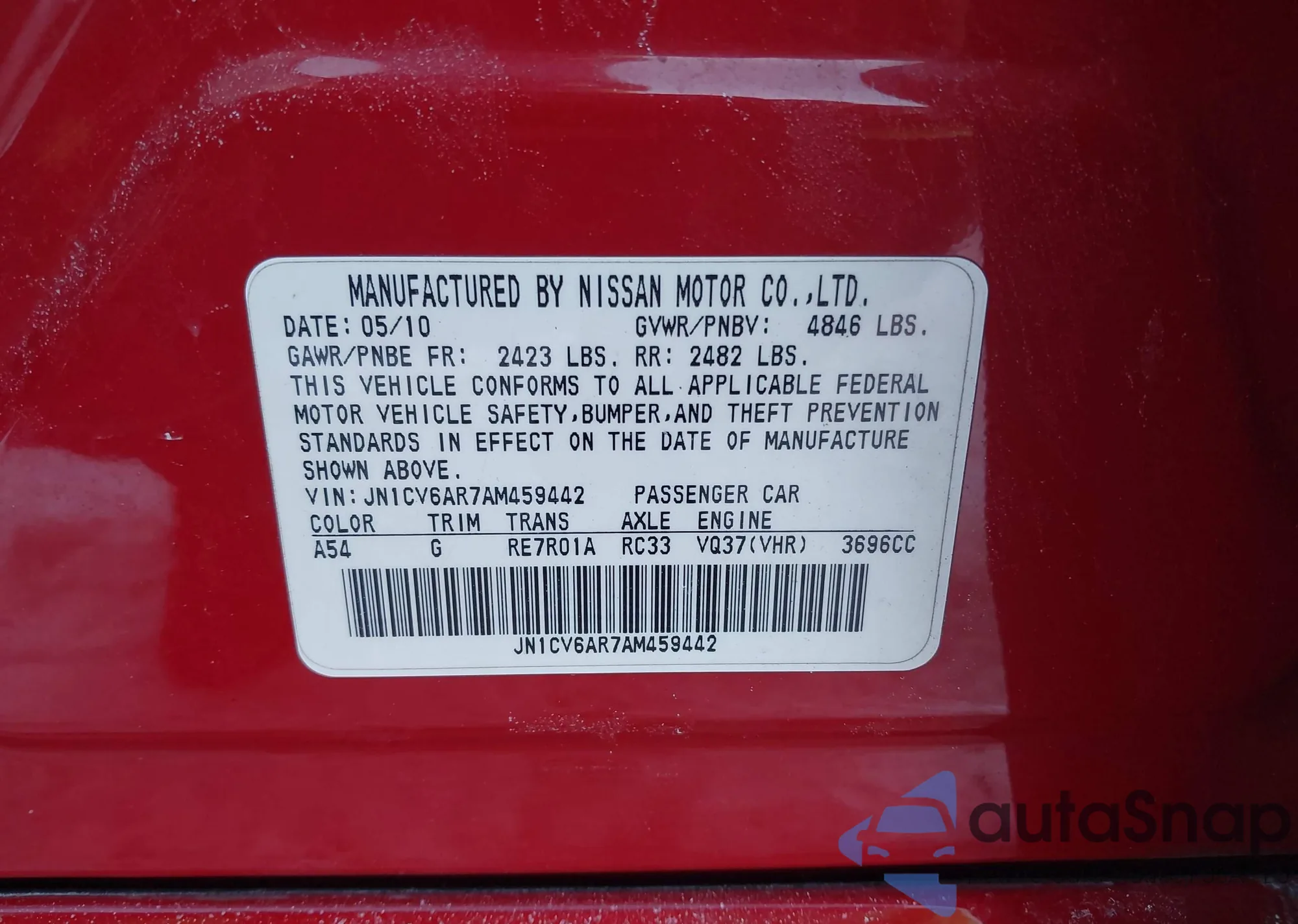 LOT: 44196020 VIN: JN1CV6AR7AM459442