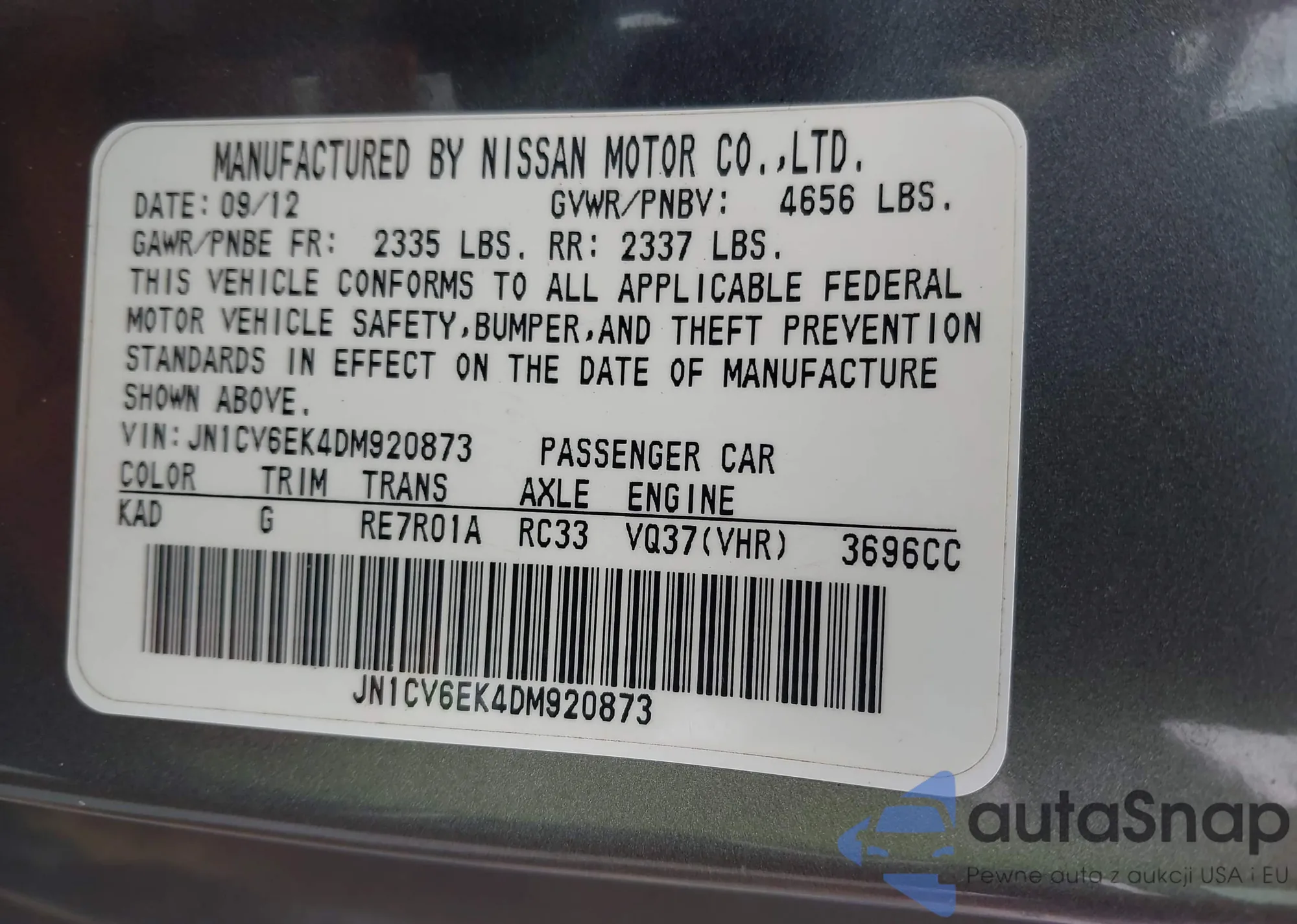 LOT: 44279013 VIN: JN1CV6EK4DM920873