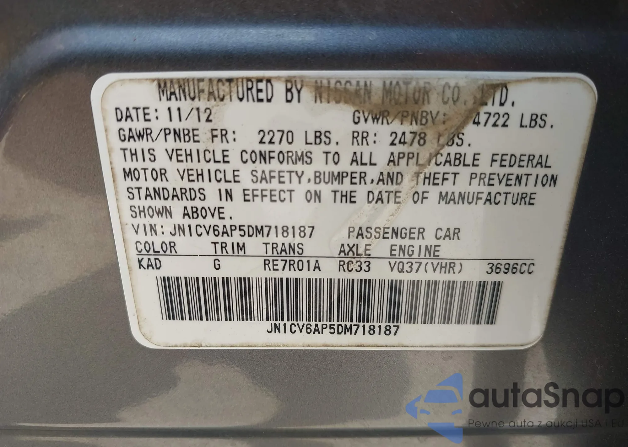 LOT: 42925221 VIN: JN1CV6AP5DM718187