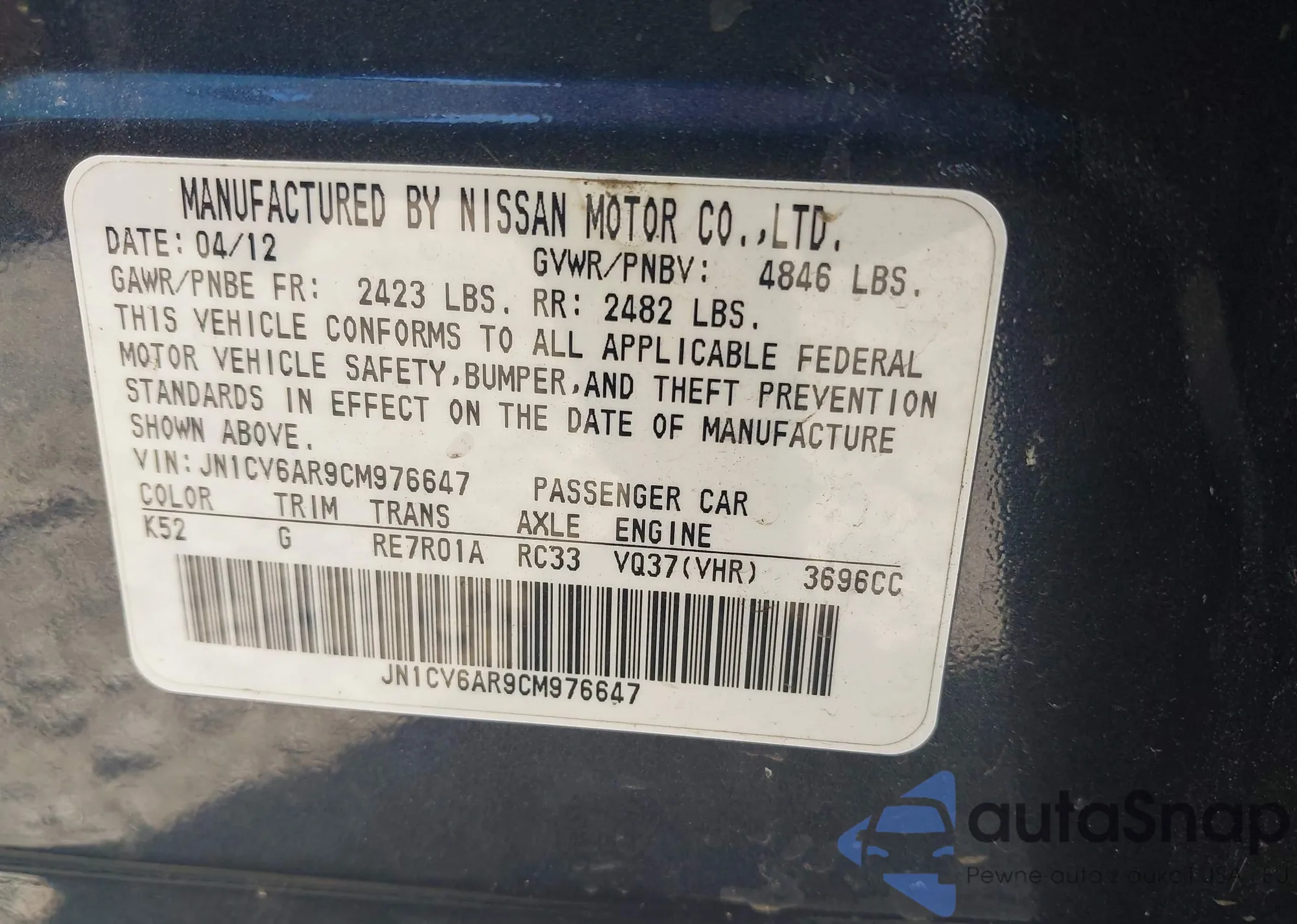LOT: 42977937 VIN: JN1CV6AR9CM976647