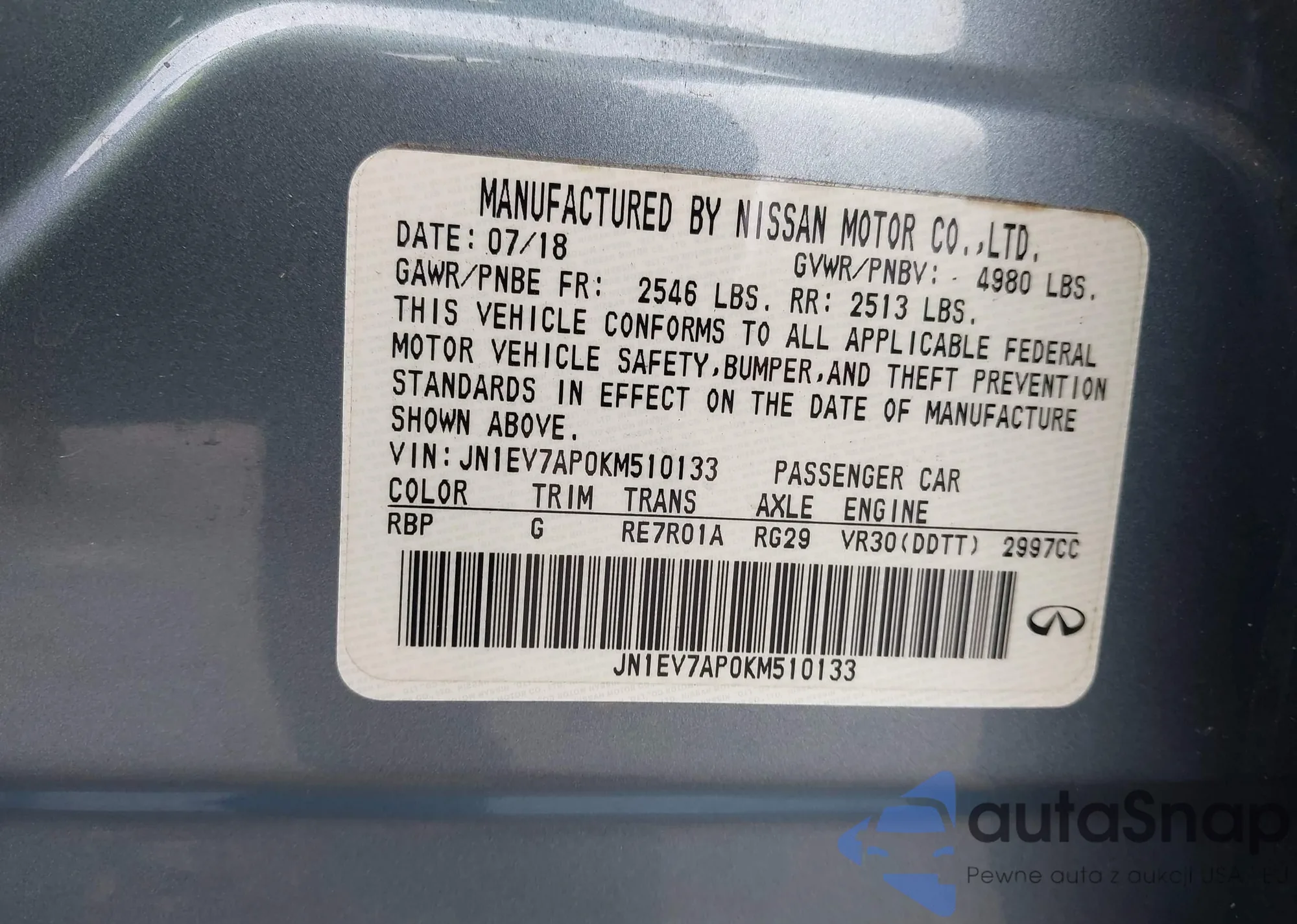 LOT: 44167572 VIN: JN1EV7AP0KM510133