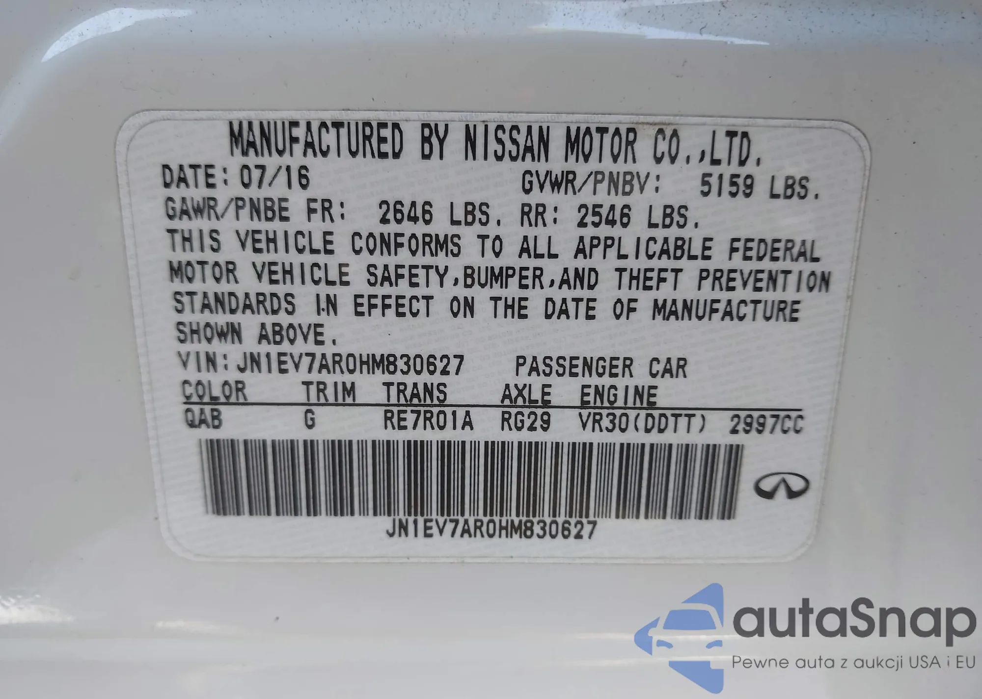 LOT: 60670505 VIN: JN1CV7AP9HM640380