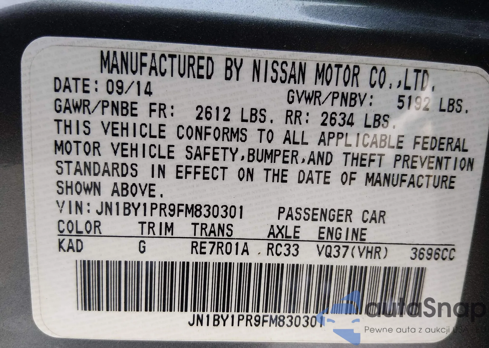 LOT: 44146127 VIN: JN1BY1AR9FM561337