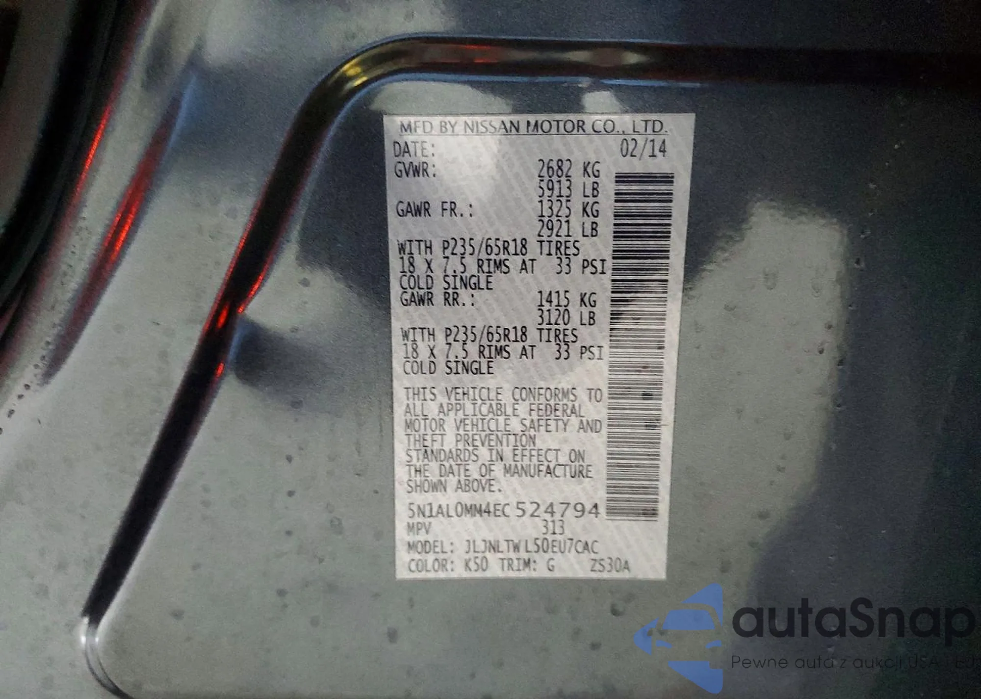LOT: 93436415 VIN: 5N1AL0MM1EC506706