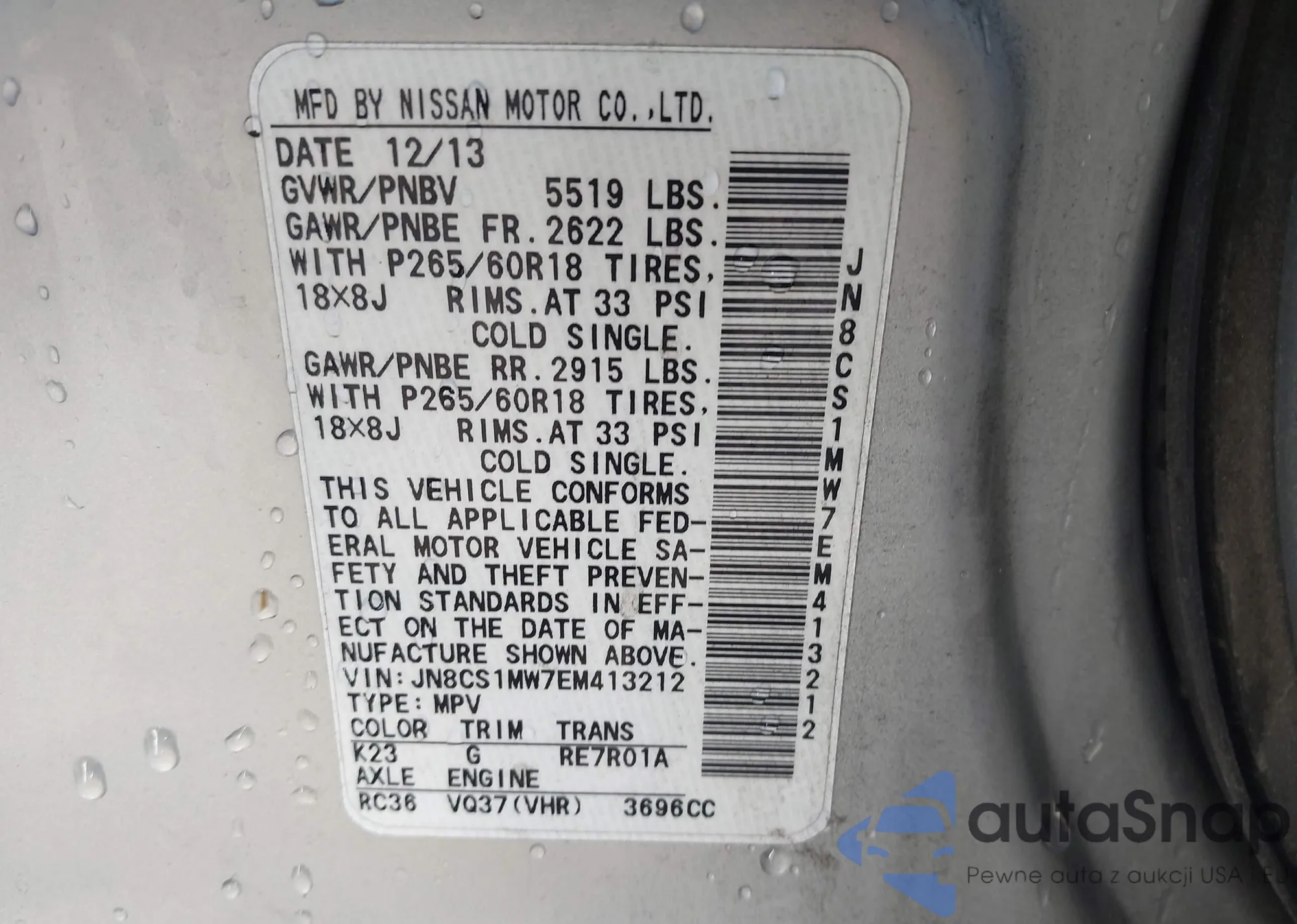 LOT: 44575304 VIN: JN8CS1MW7EM413212