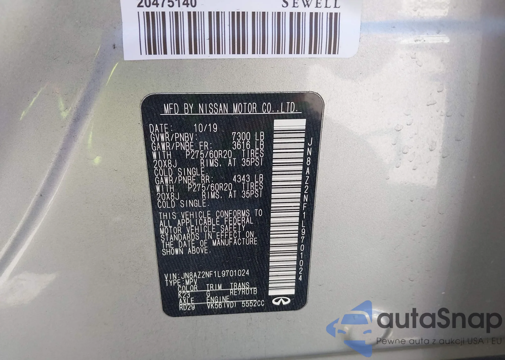 LOT: 44492876 VIN: JN8AZ2NF1L9701024