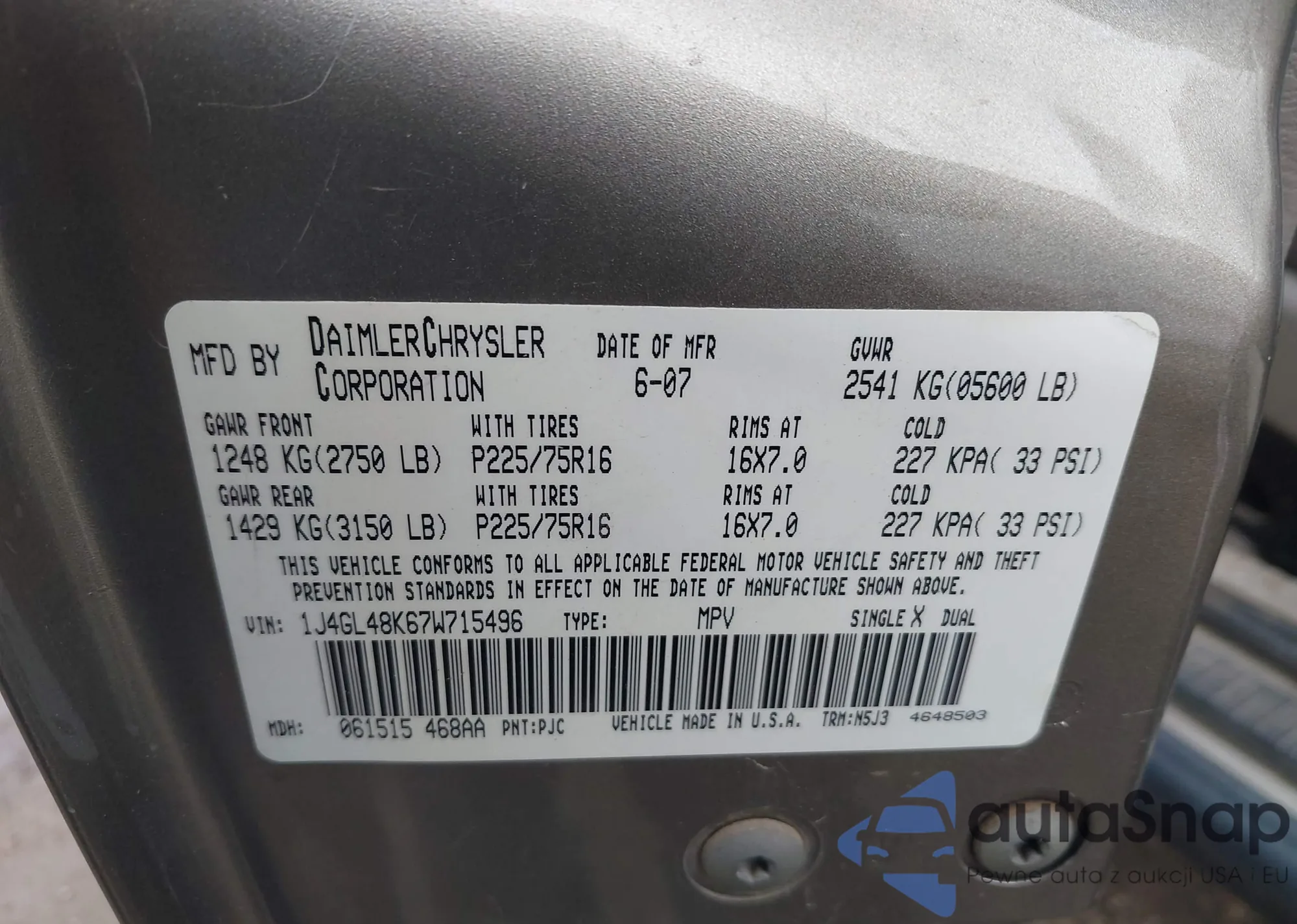 • VIN 1J4GL48K67W715496