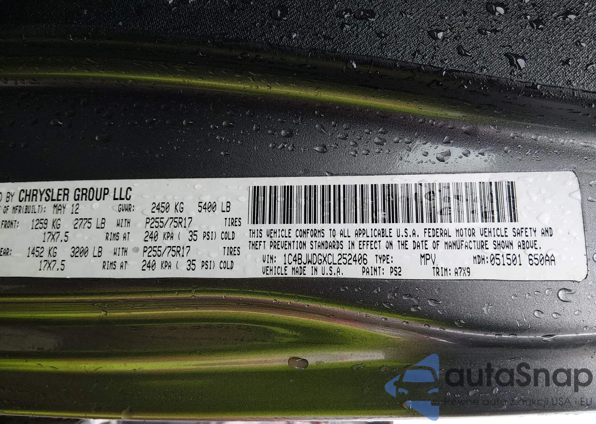 • VIN 1C4HJWDG8CL251927