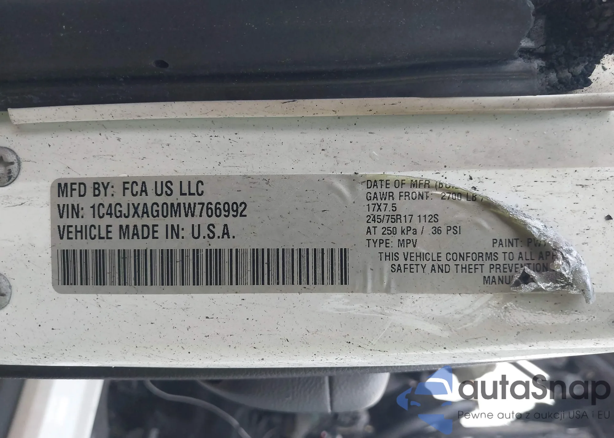 LOT: 43953329 VIN: 1C4HJXCN7MW670650
