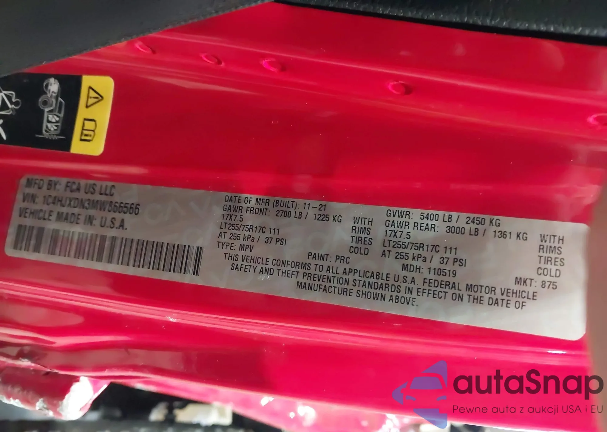 • VIN 1C4HJXDN3MW866566