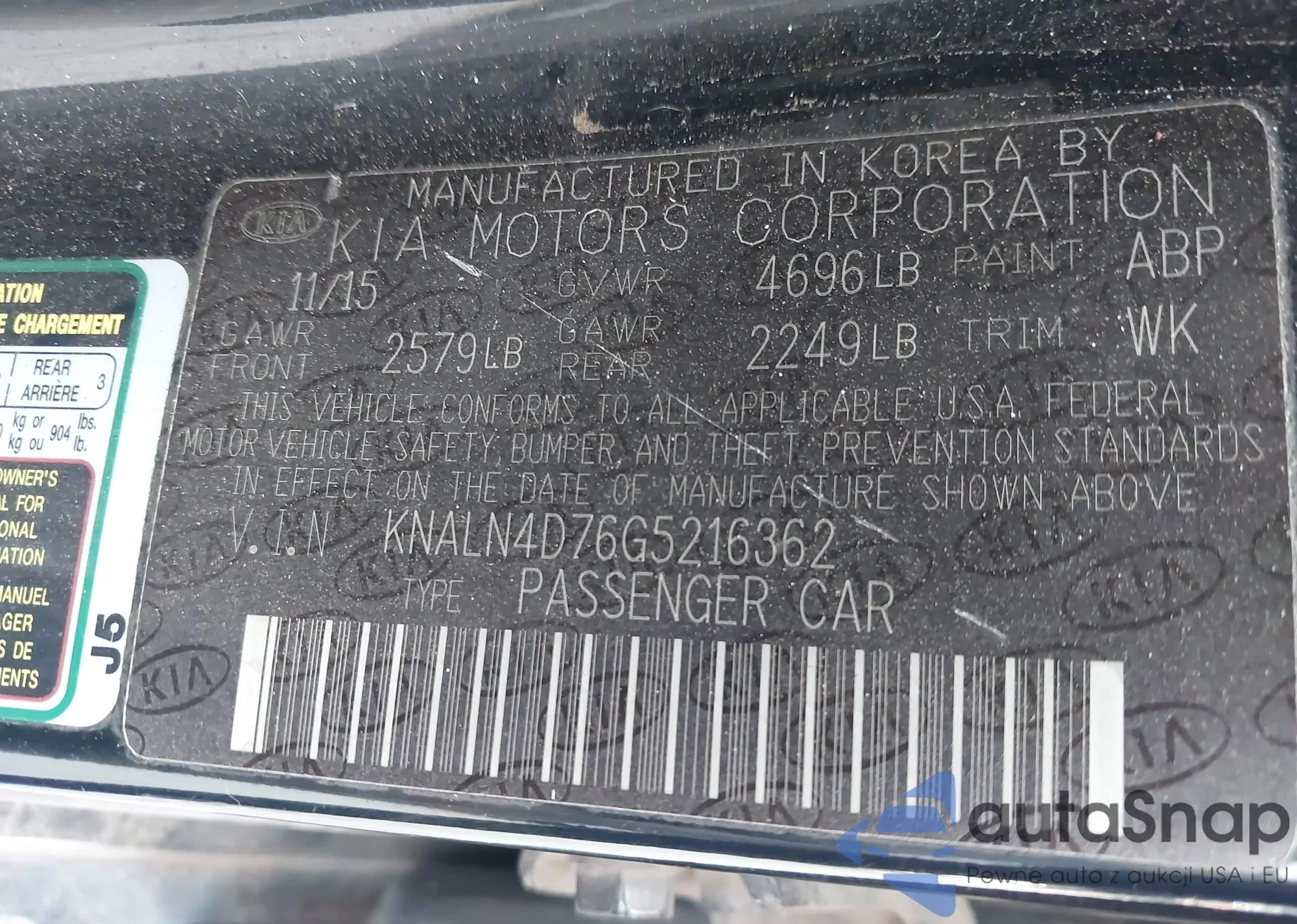LOT: 43945994 VIN: KNALN4D76G5216362