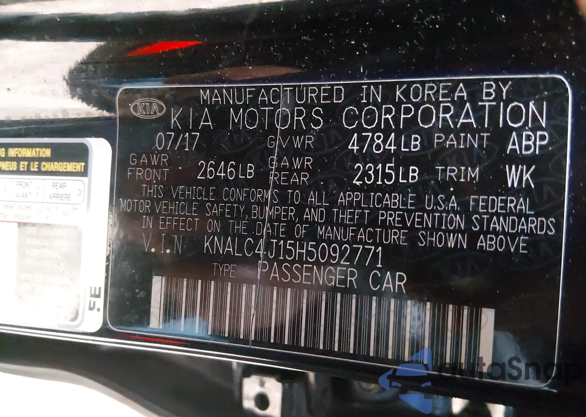 LOT: 43973318 VIN: KNALC4J15H5092771