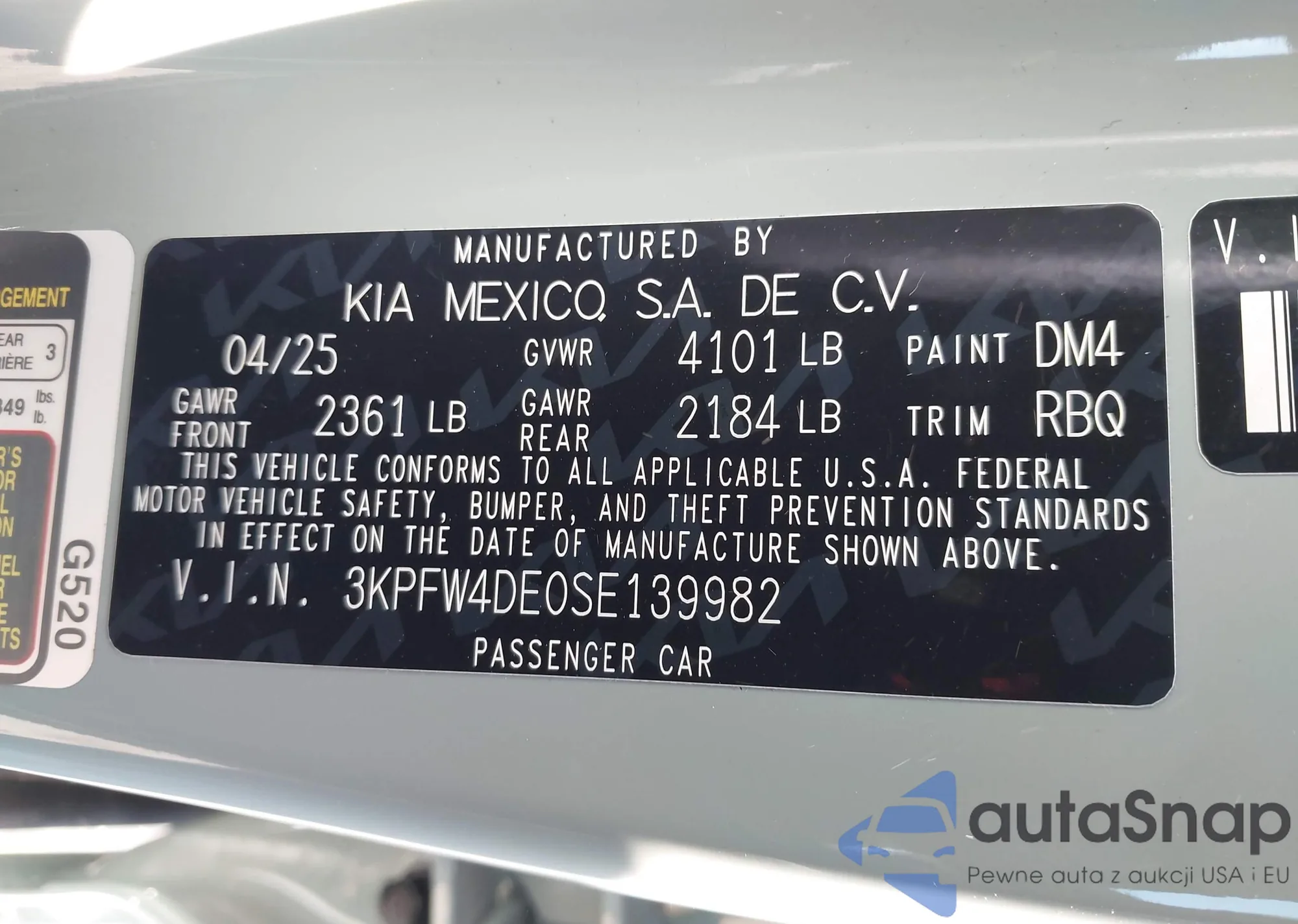 LOT: 87394435 VIN: 3KPFT4DE6SE160795