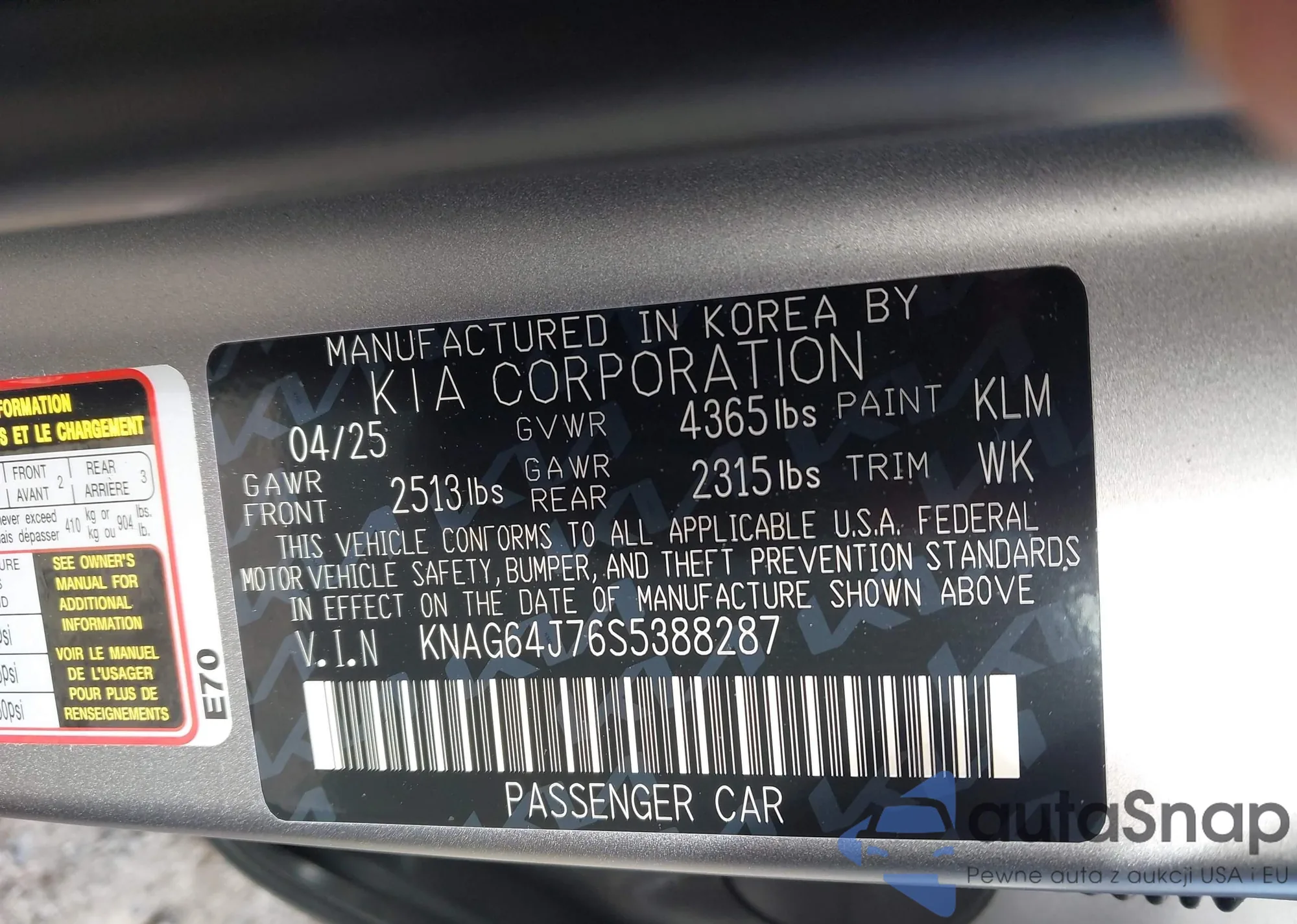 • VIN KNAG64J78S5373001