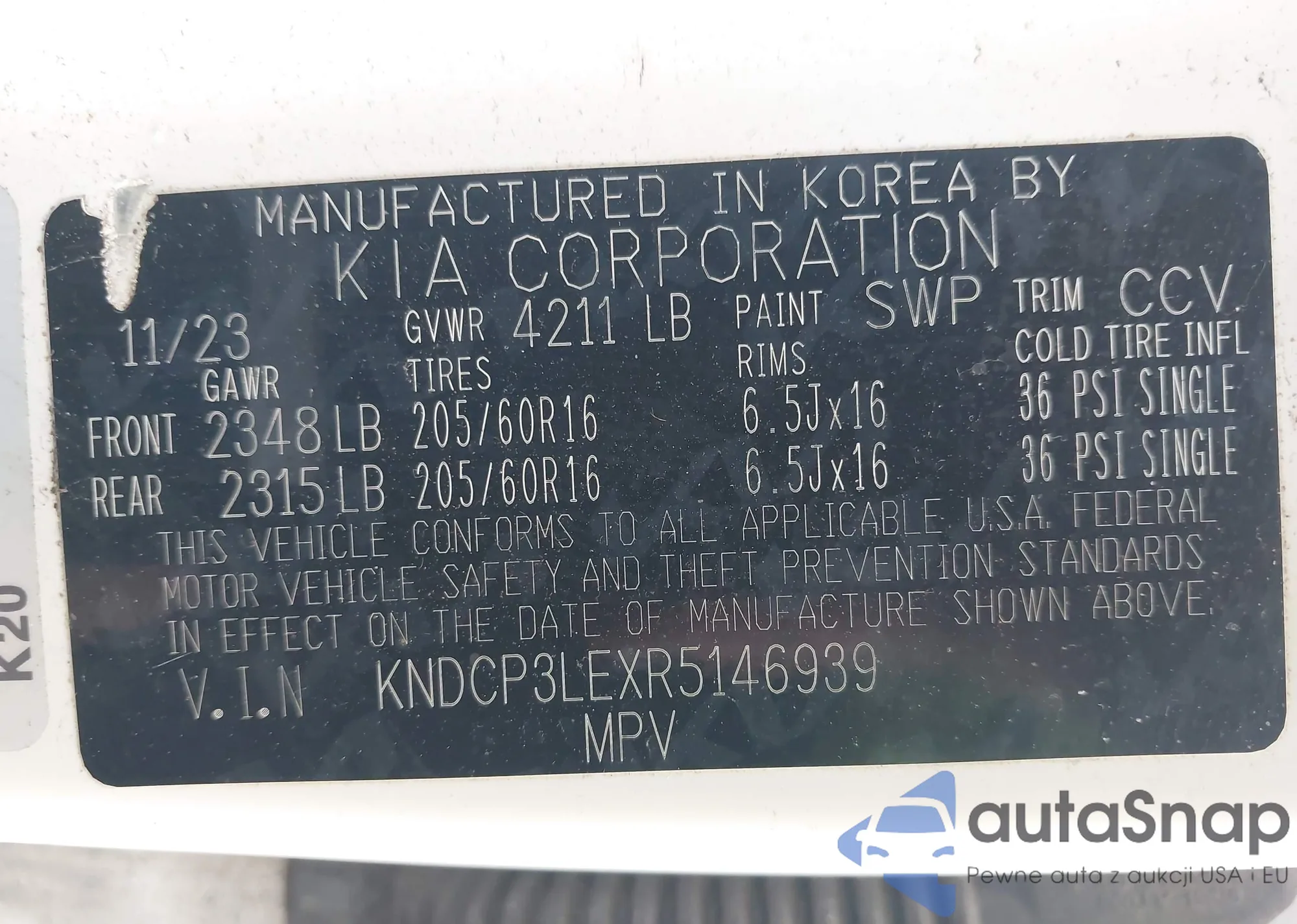 LOT: 44239695 VIN: KNDCP3LEXR5146939