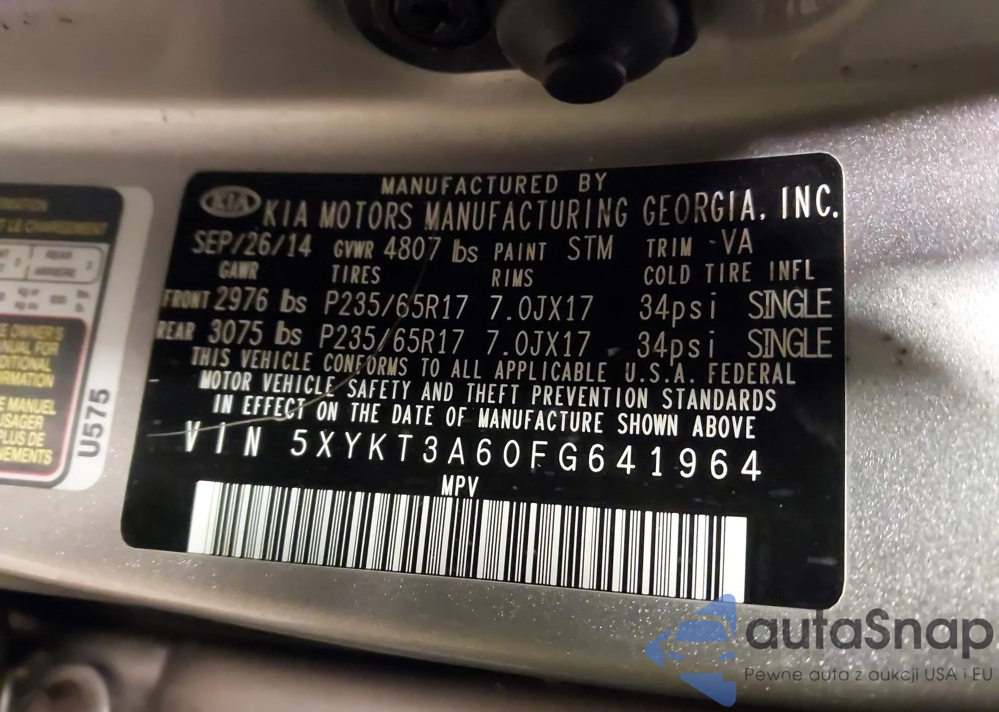 LOT: 43942370 VIN: 5XYKT3A60FG641964