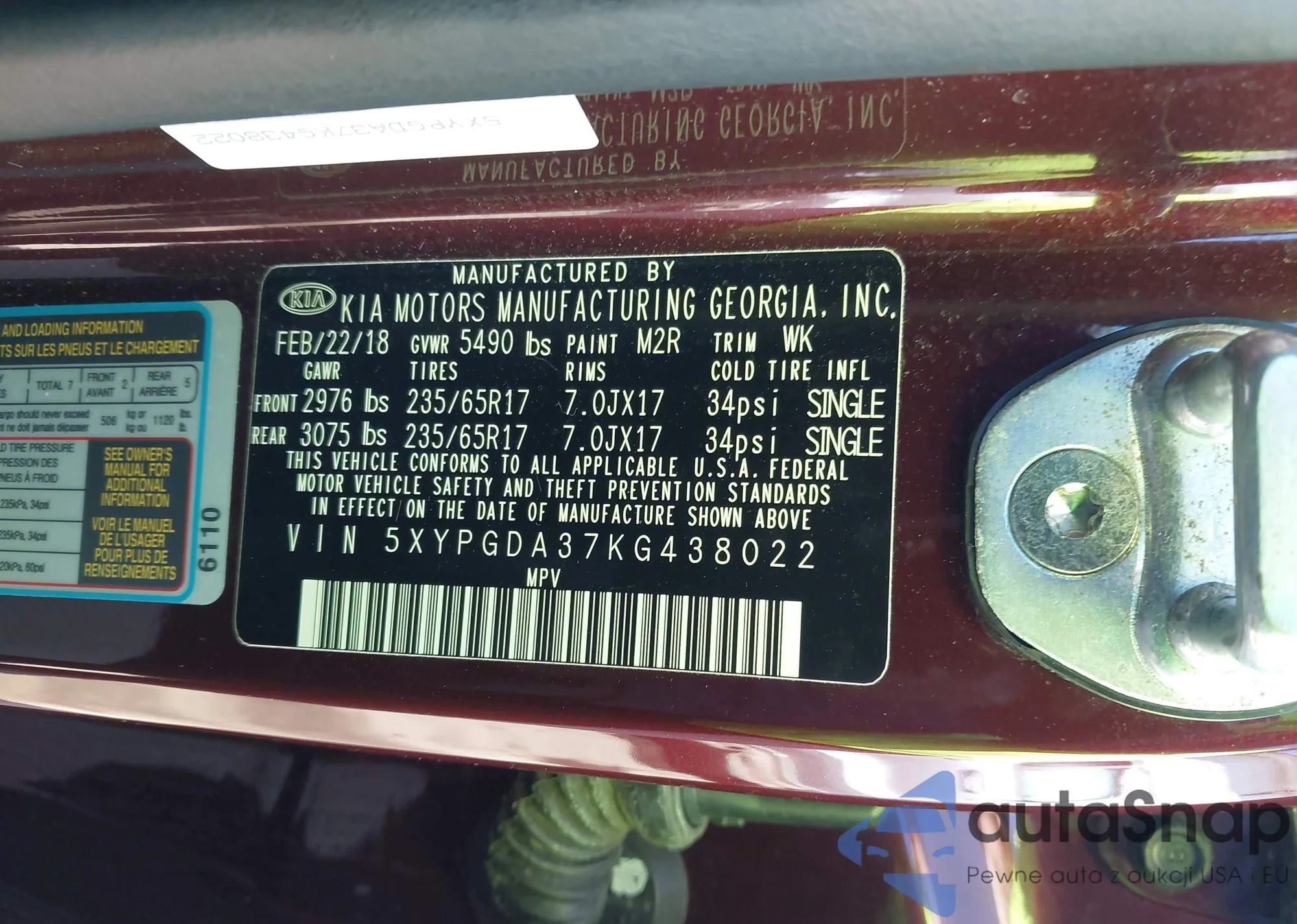 • VIN 5XYPGDA37KG438022