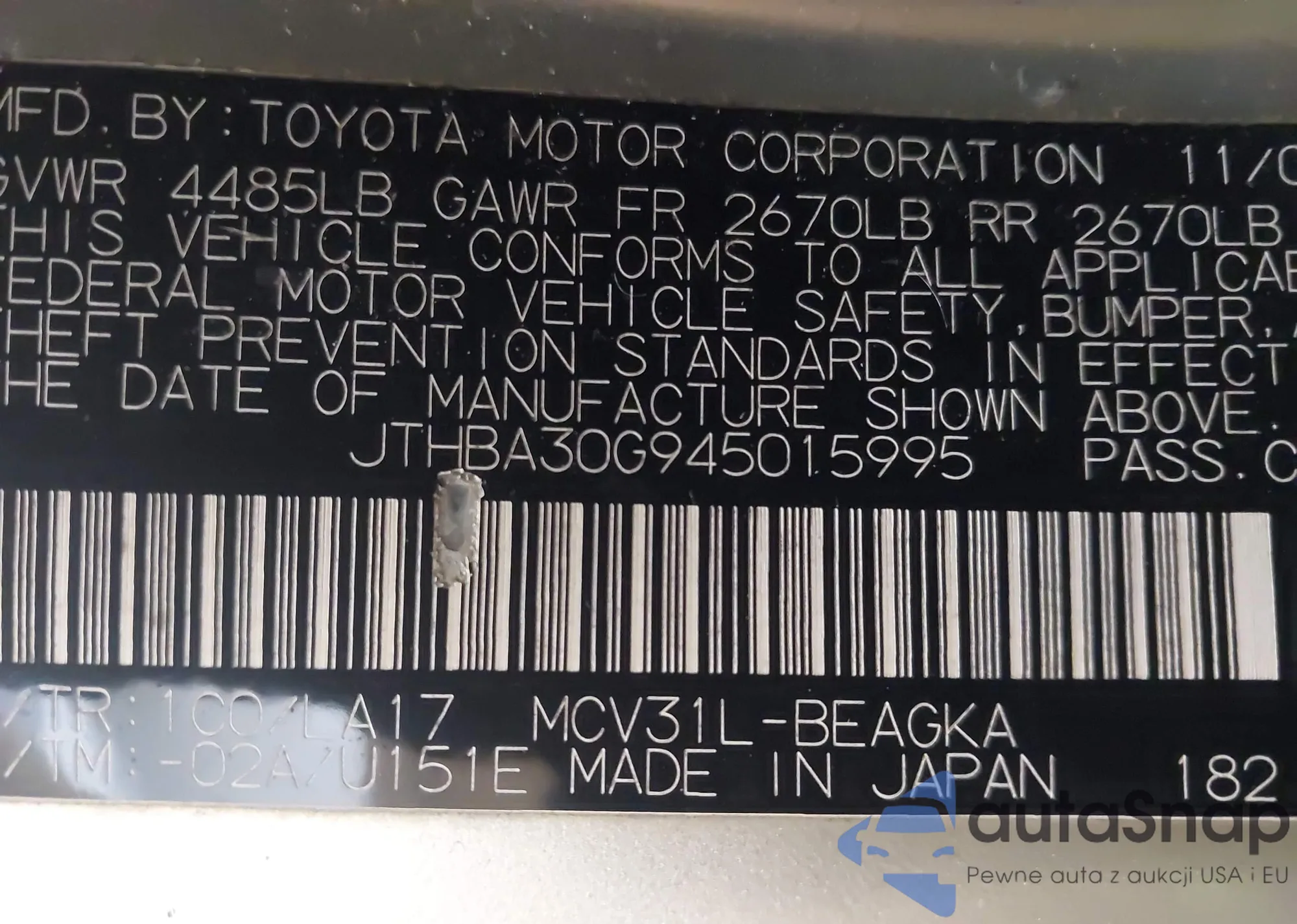 LOT: 44265023 VIN: JTHBA30G945015995