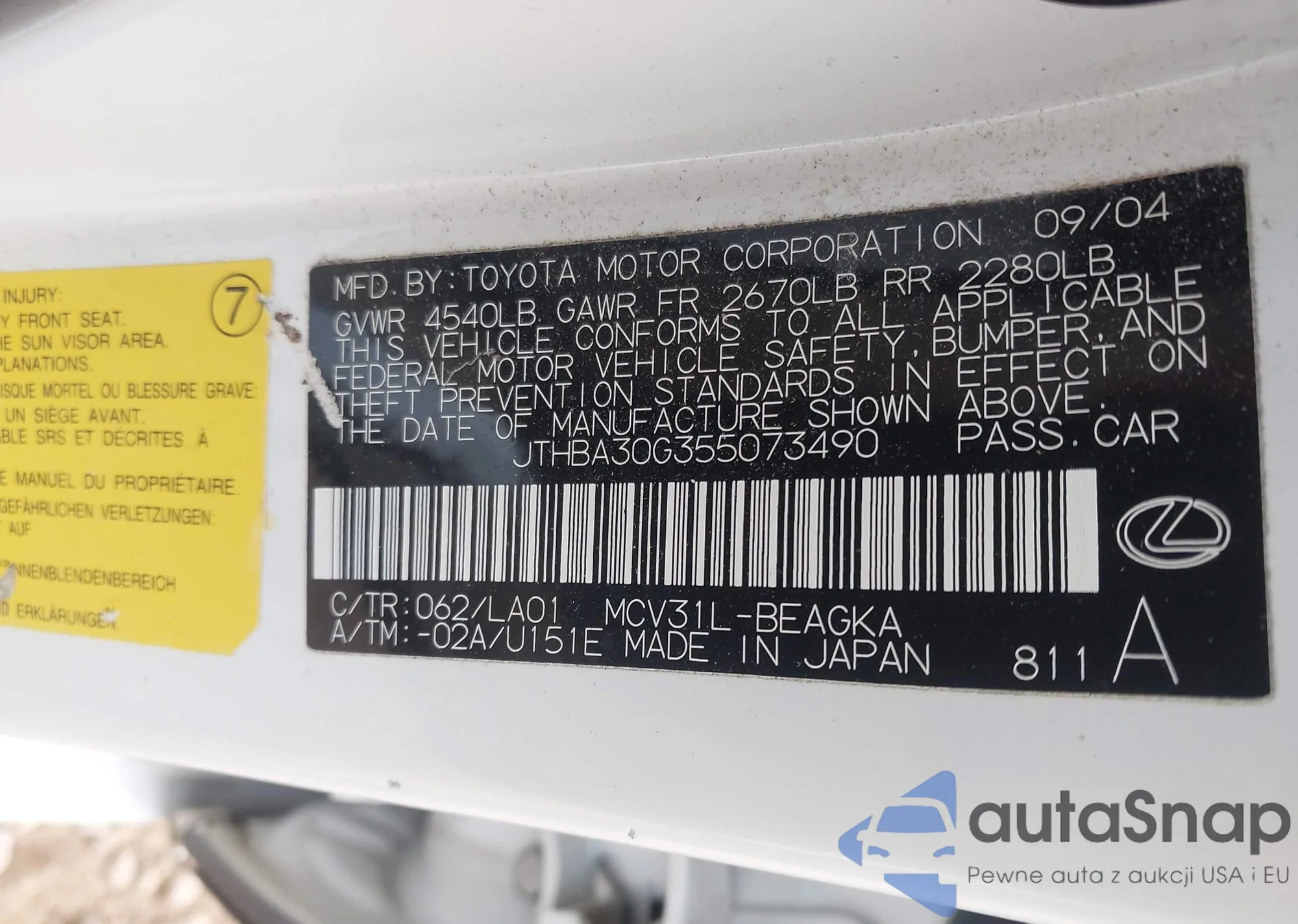 LOT: 44290438 VIN: JTHBA30G455094946