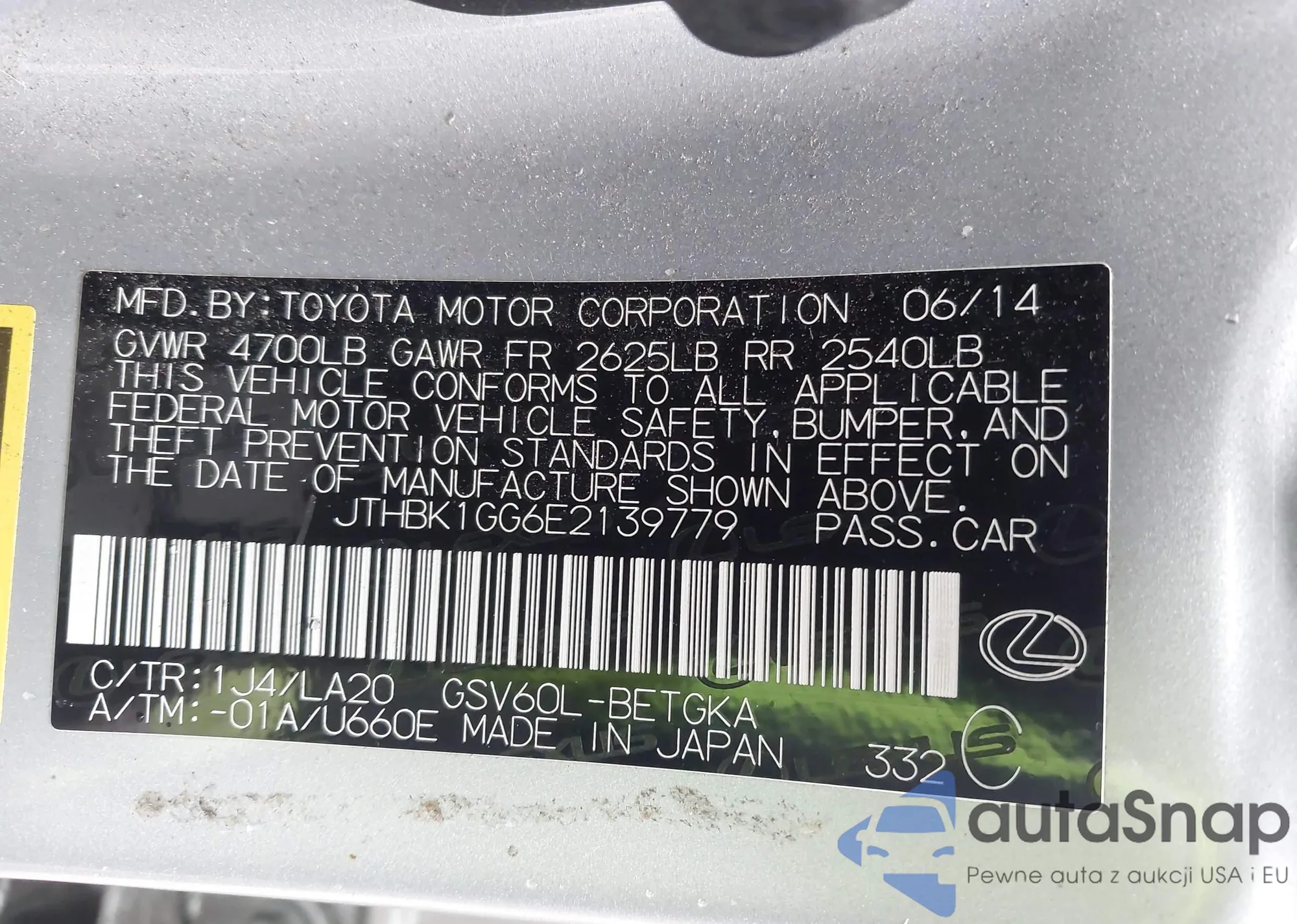 • VIN JTHBK1GG6E2139779