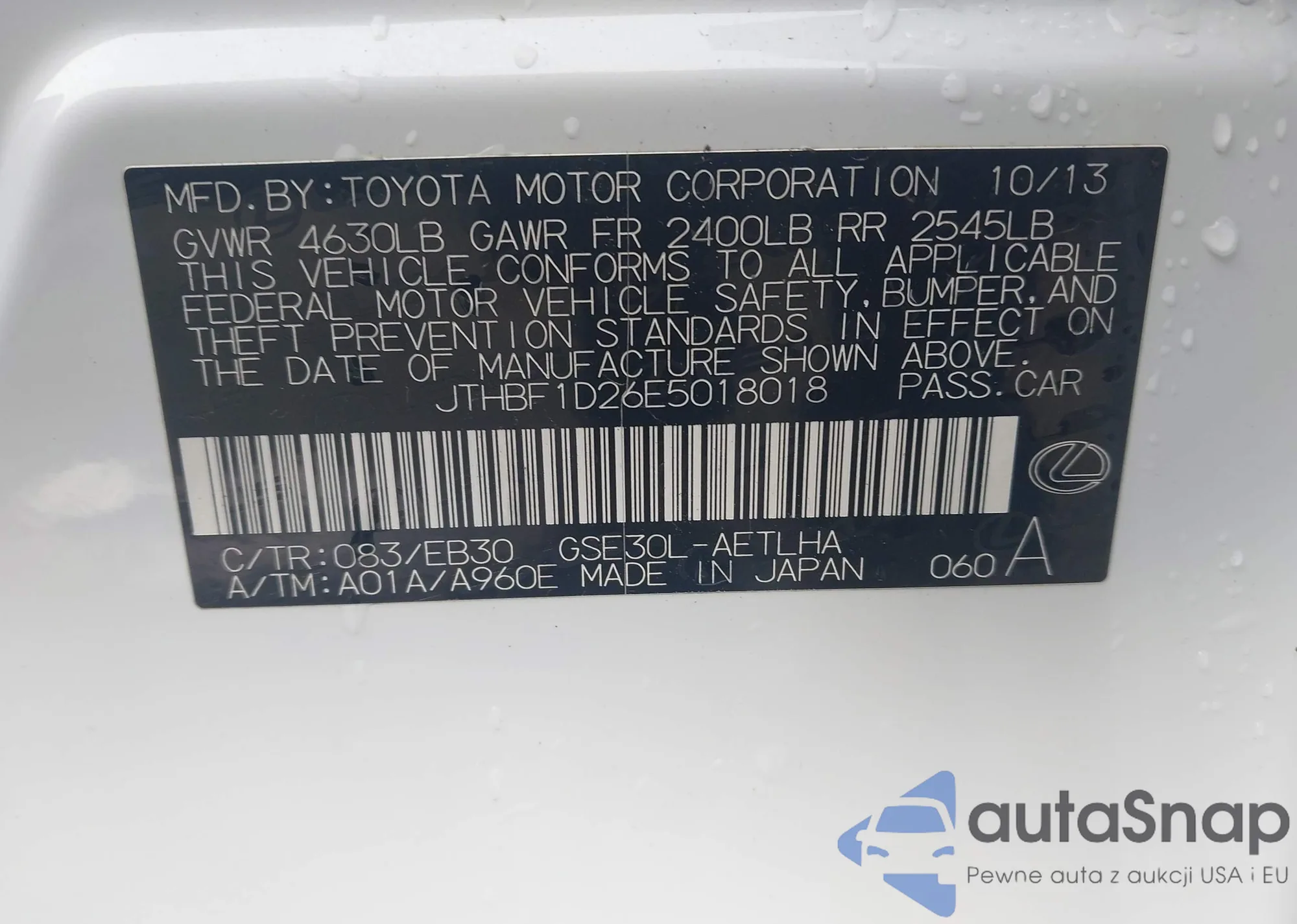 LOT: 44139810 VIN: JTHBF1D26E5018018