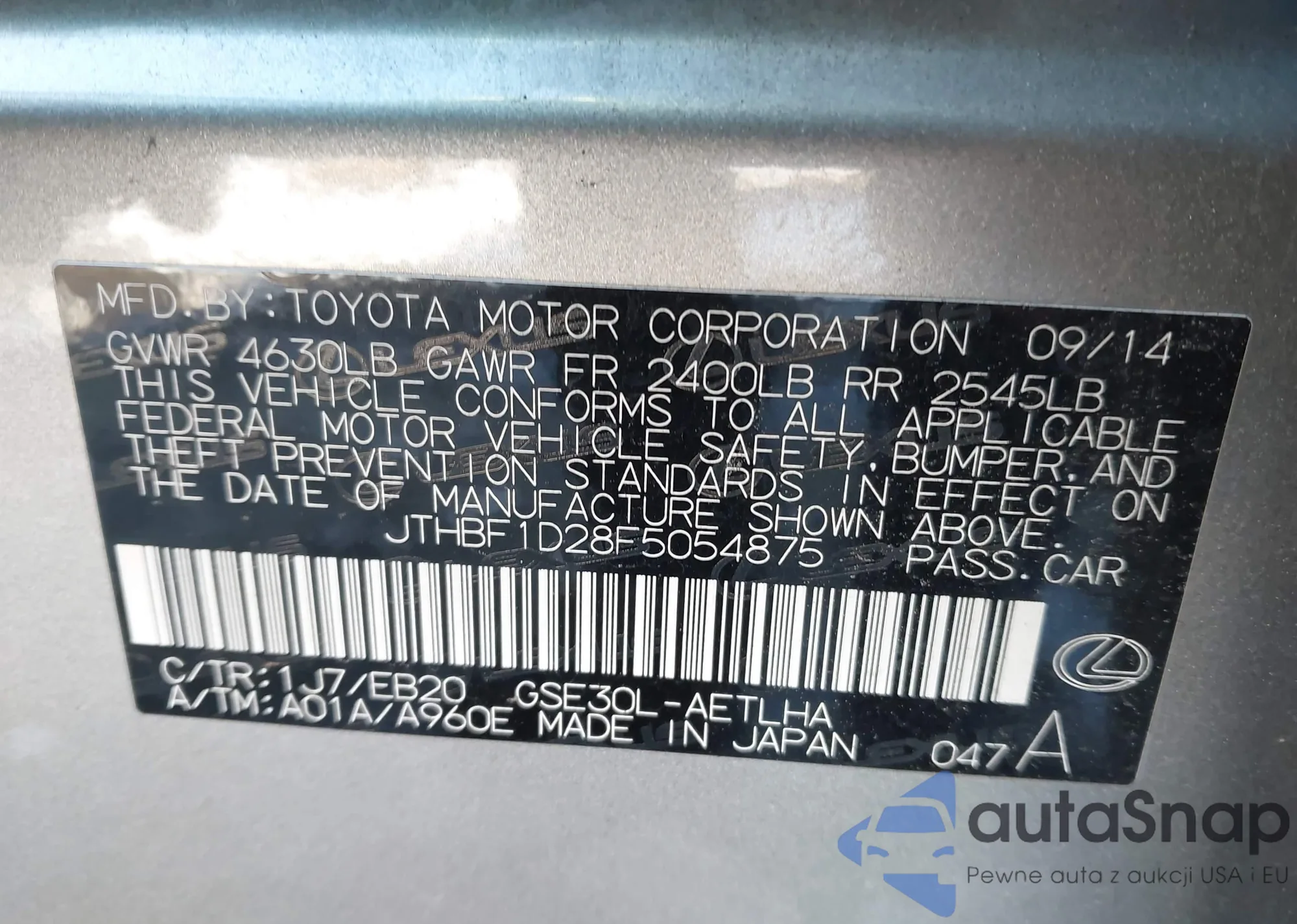 LOT: 44256784 VIN: JTHBF1D28F5054875