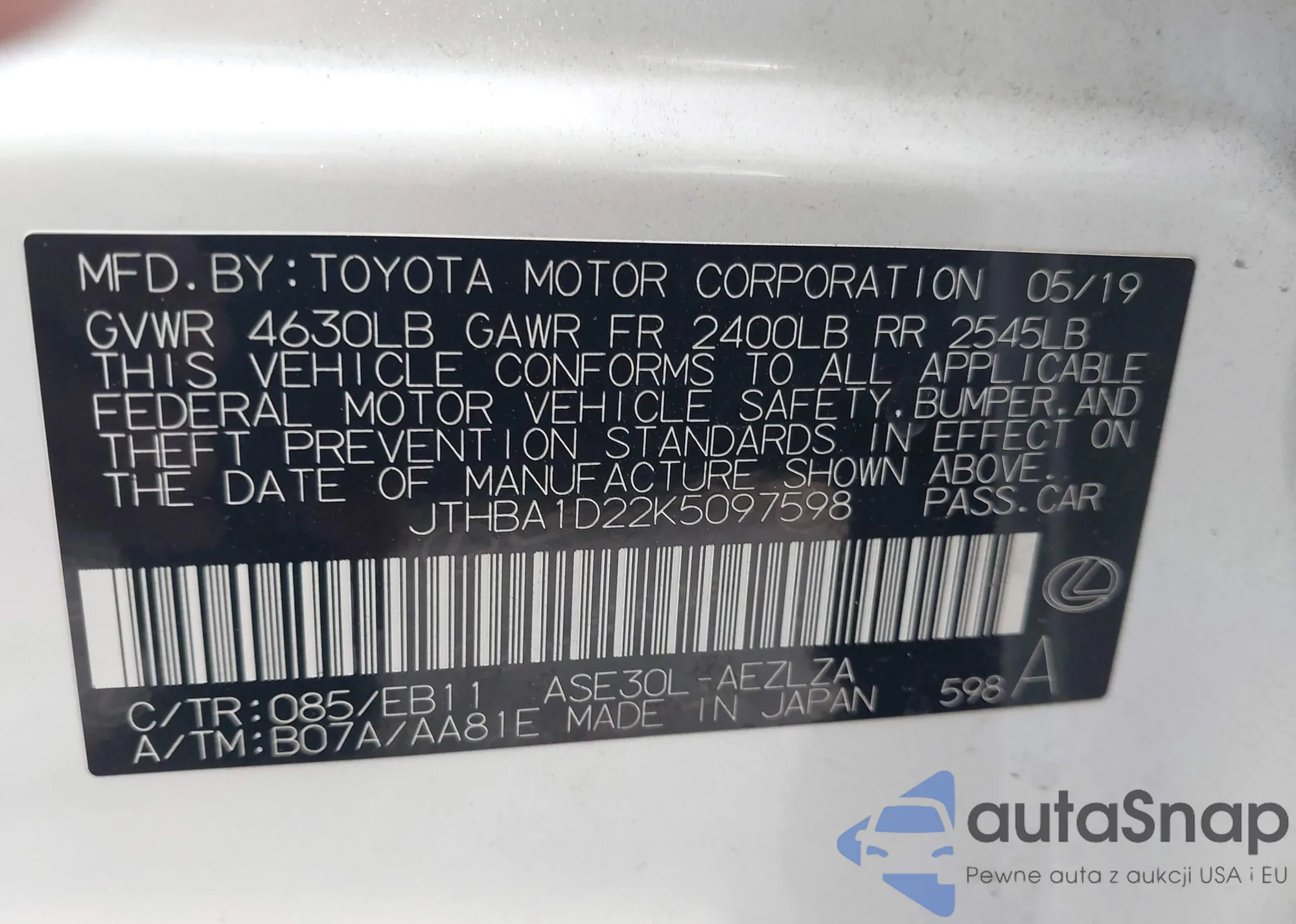 LOT: 44320005 VIN: JTHBA1D20K5098913