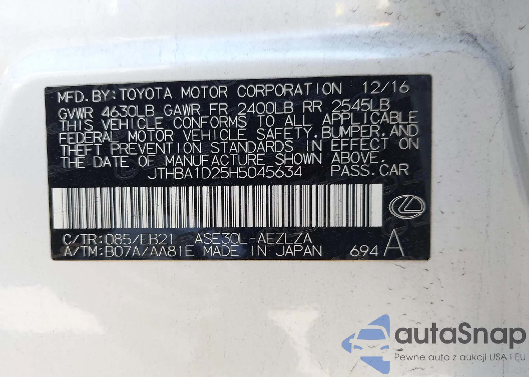 • VIN JTHBA1D25H5045634