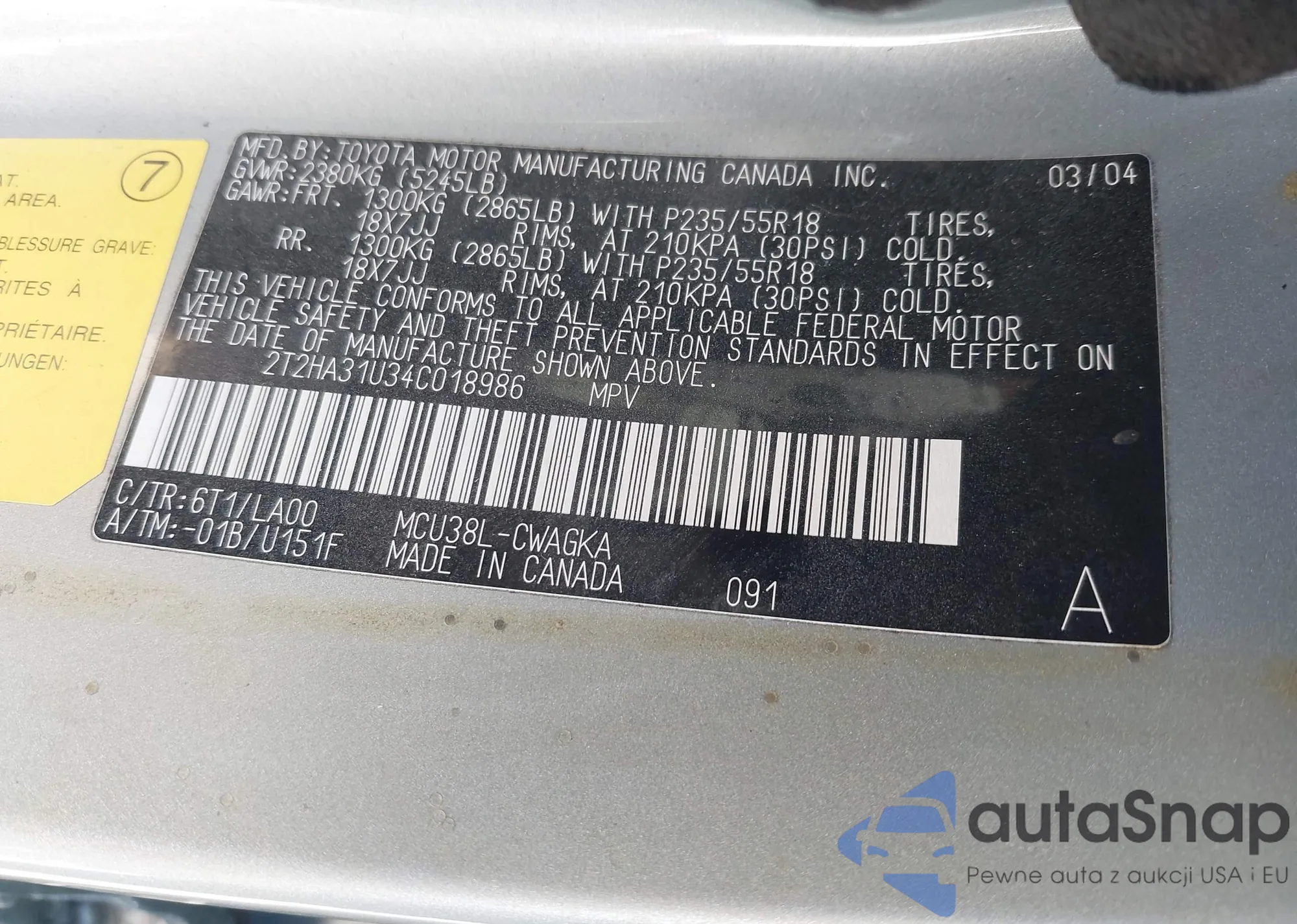 LOT: 44257027 VIN: 2T2HA31U34C018986