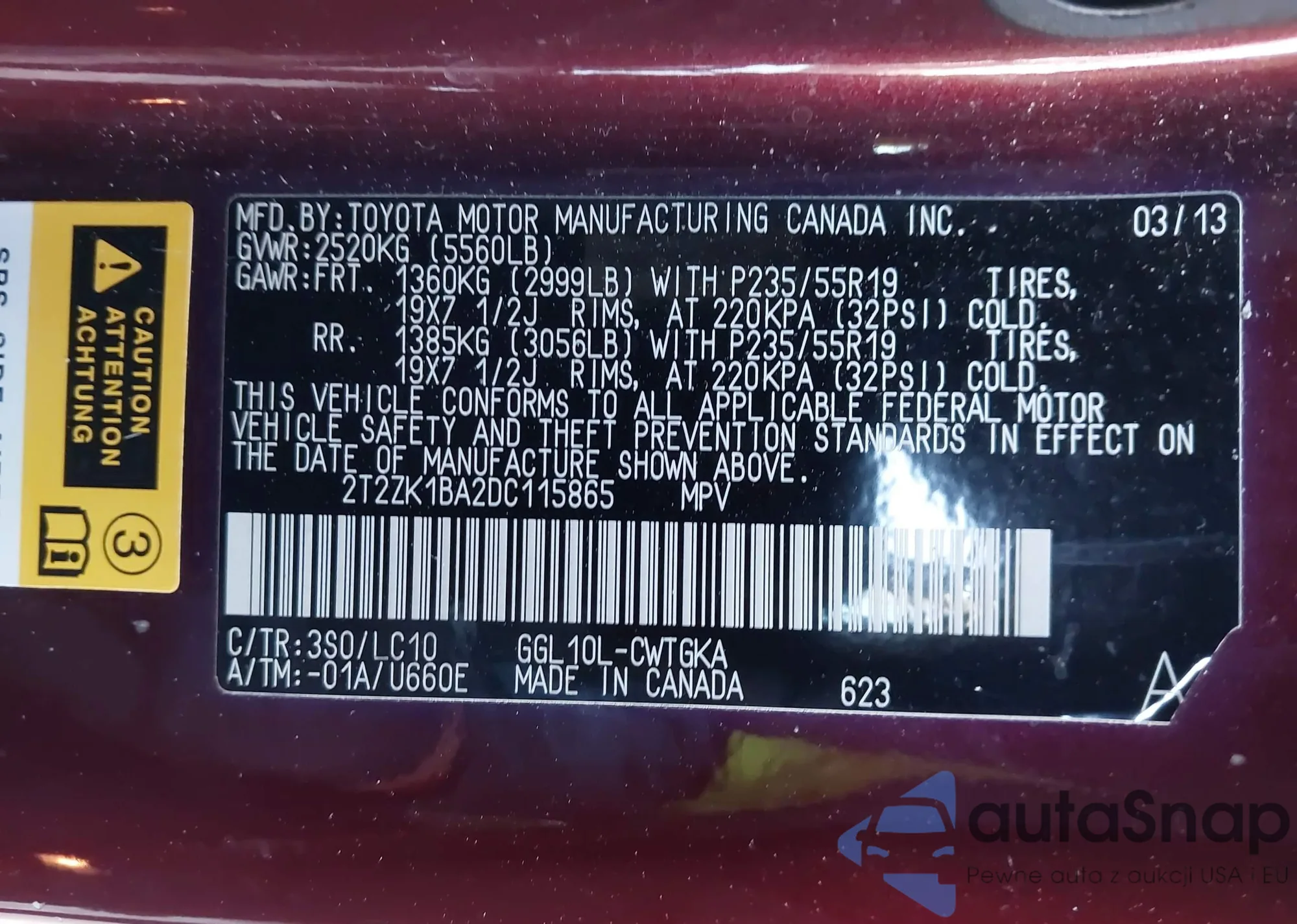 • VIN 2T2ZK1BA7DC116073