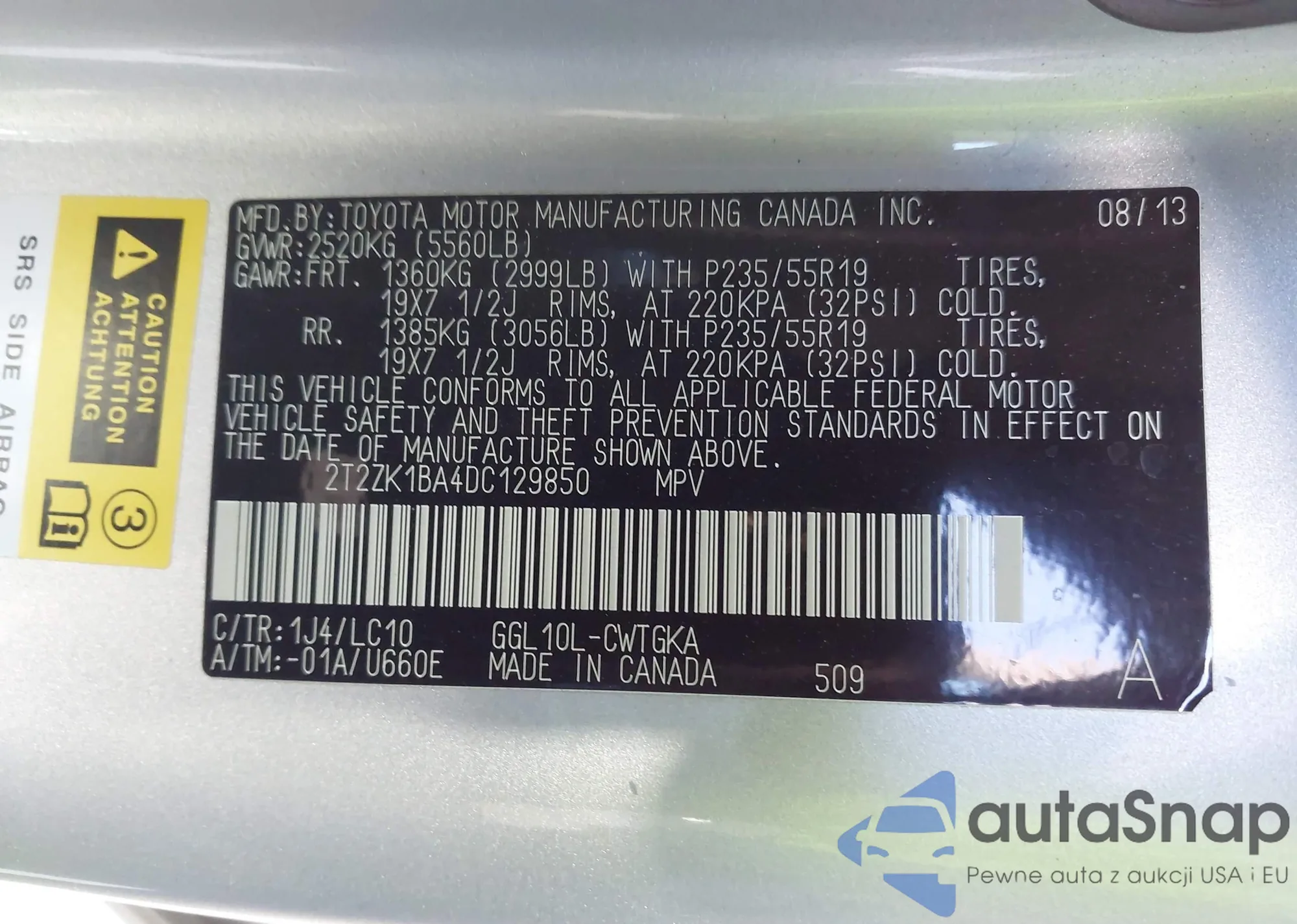 • VIN 2T2ZK1BA4DC129850
