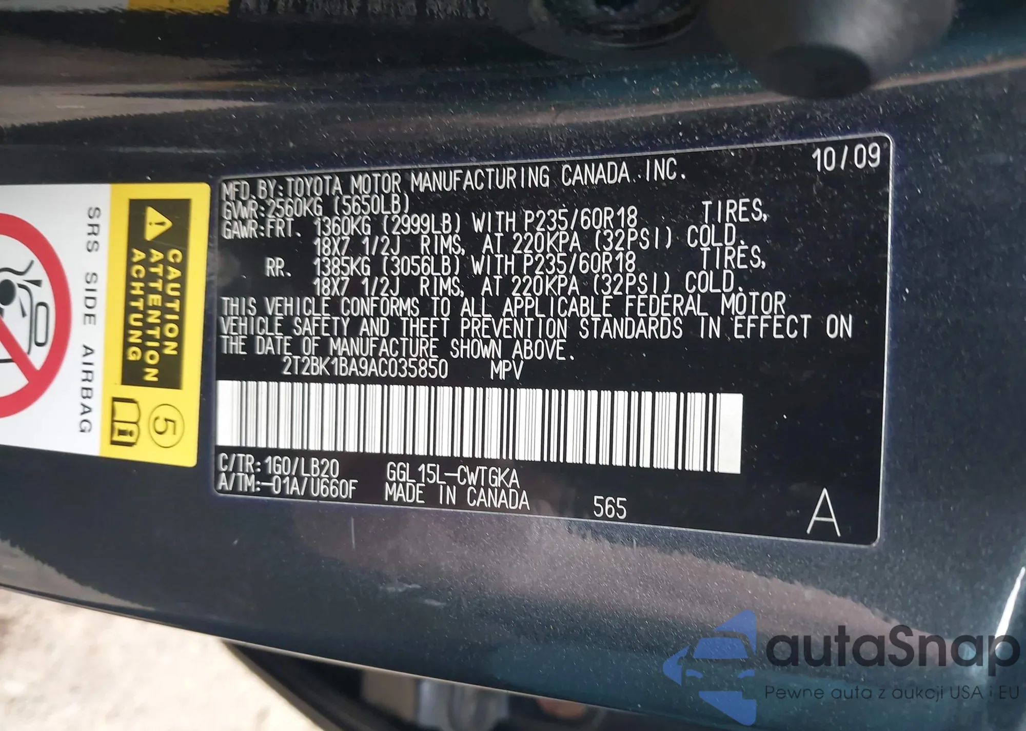 • VIN 2T2BK1BA9AC035850
