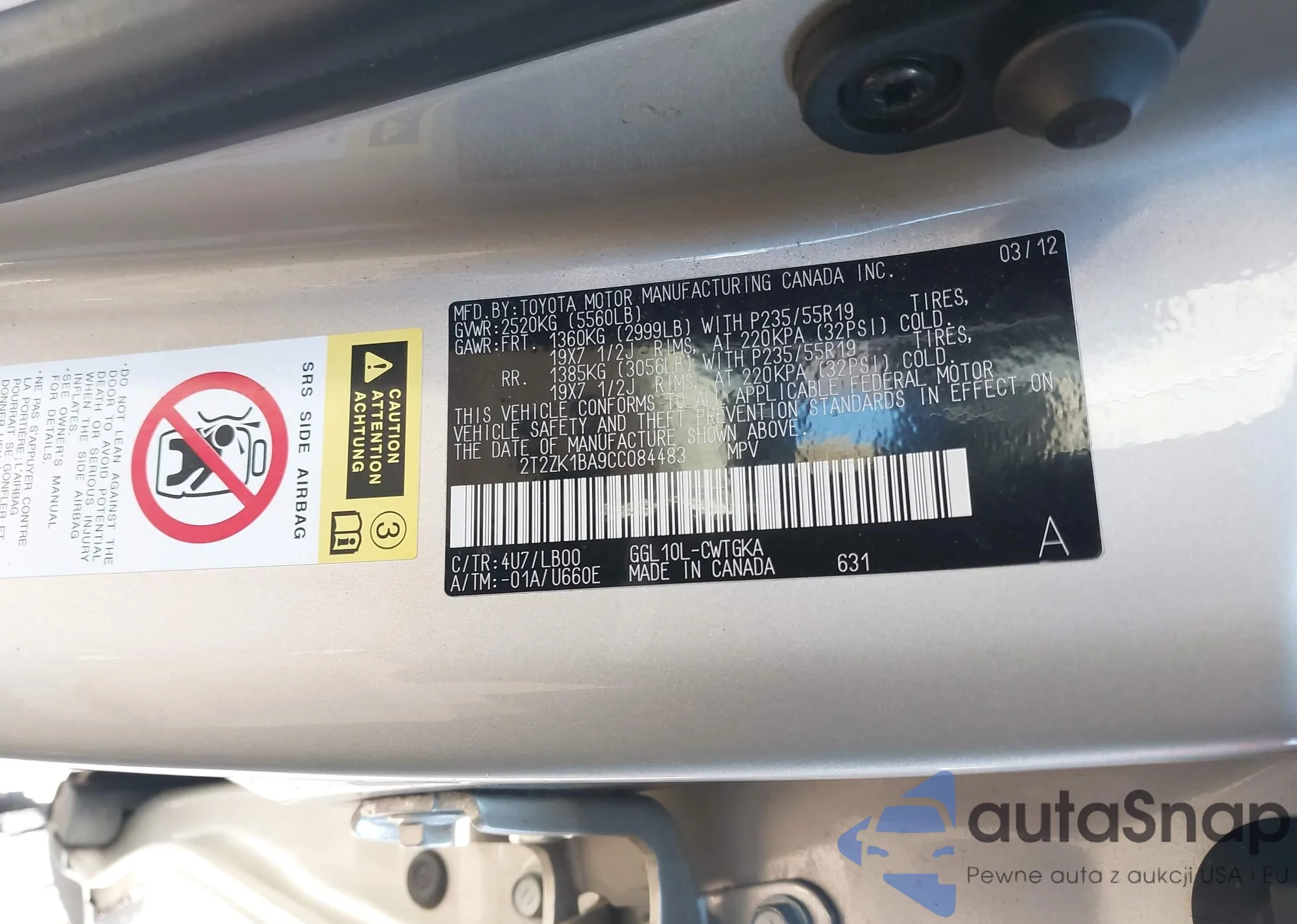• VIN 2T2ZK1BA9CC084483