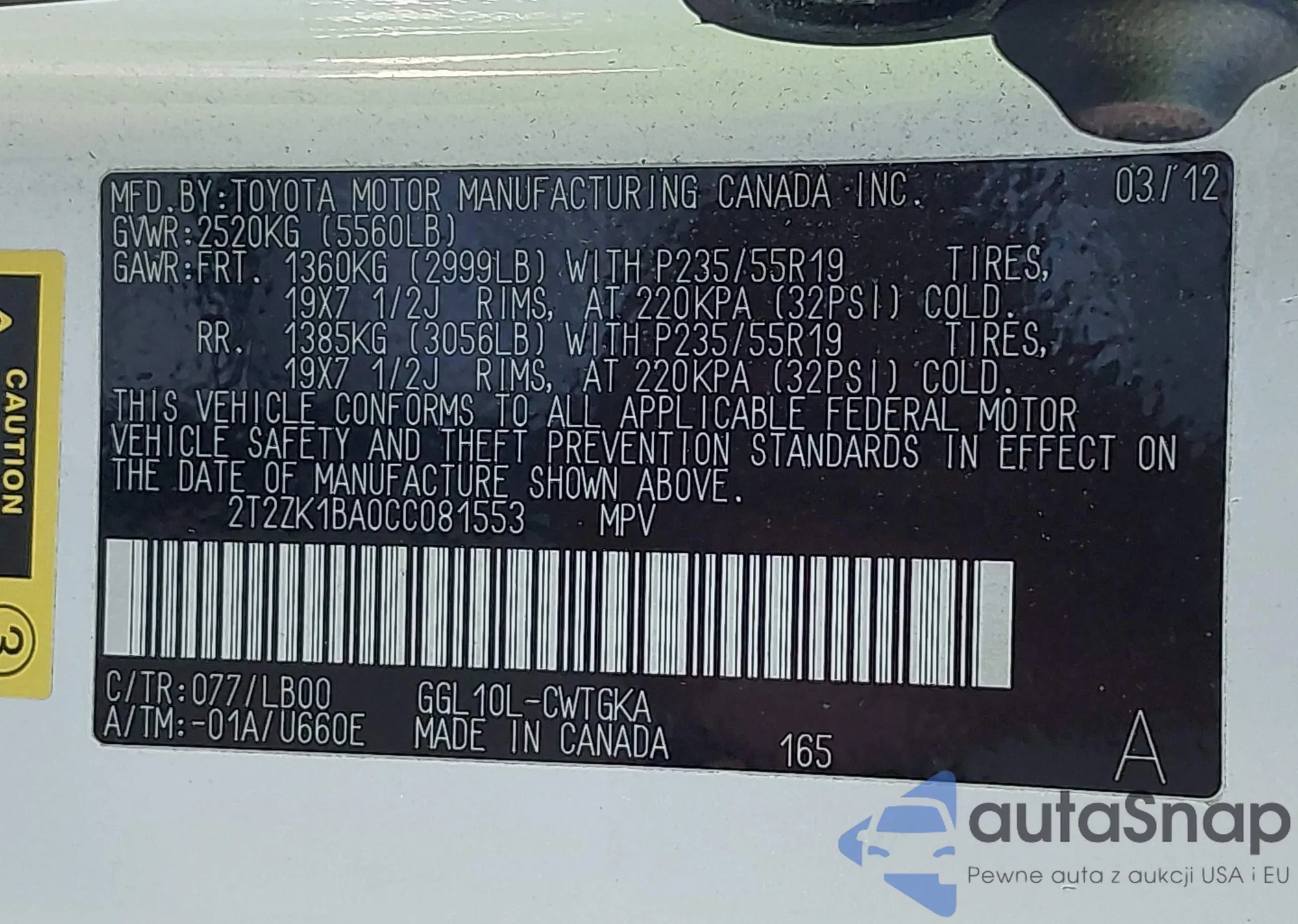 • VIN 2T2ZK1BA0CC081553