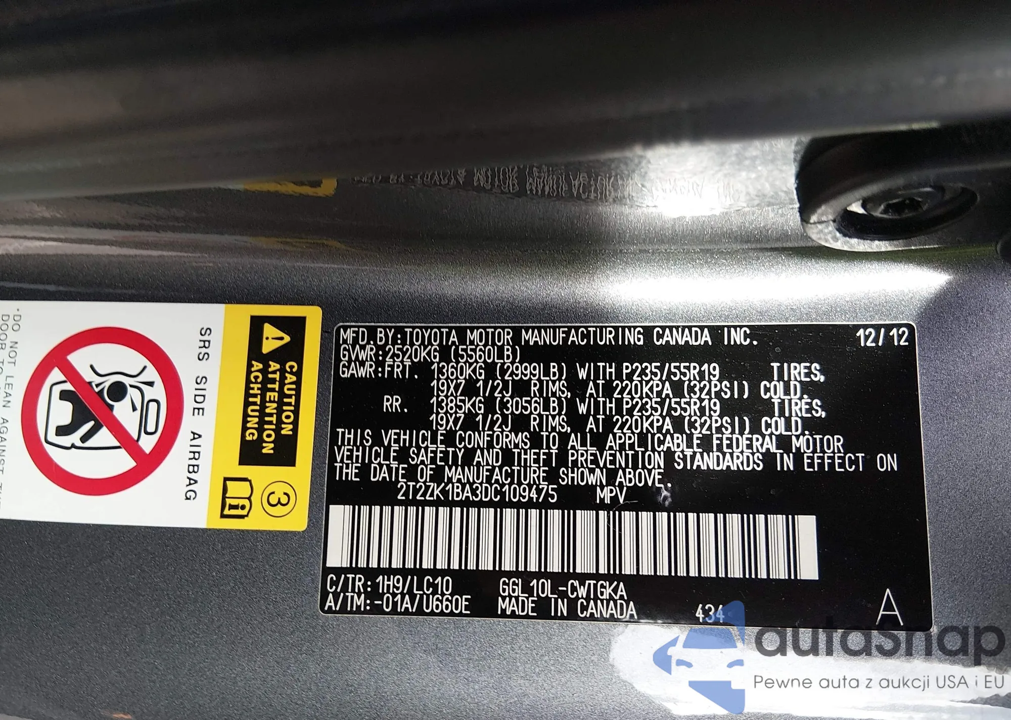 • VIN 2T2ZK1BA3DC109475