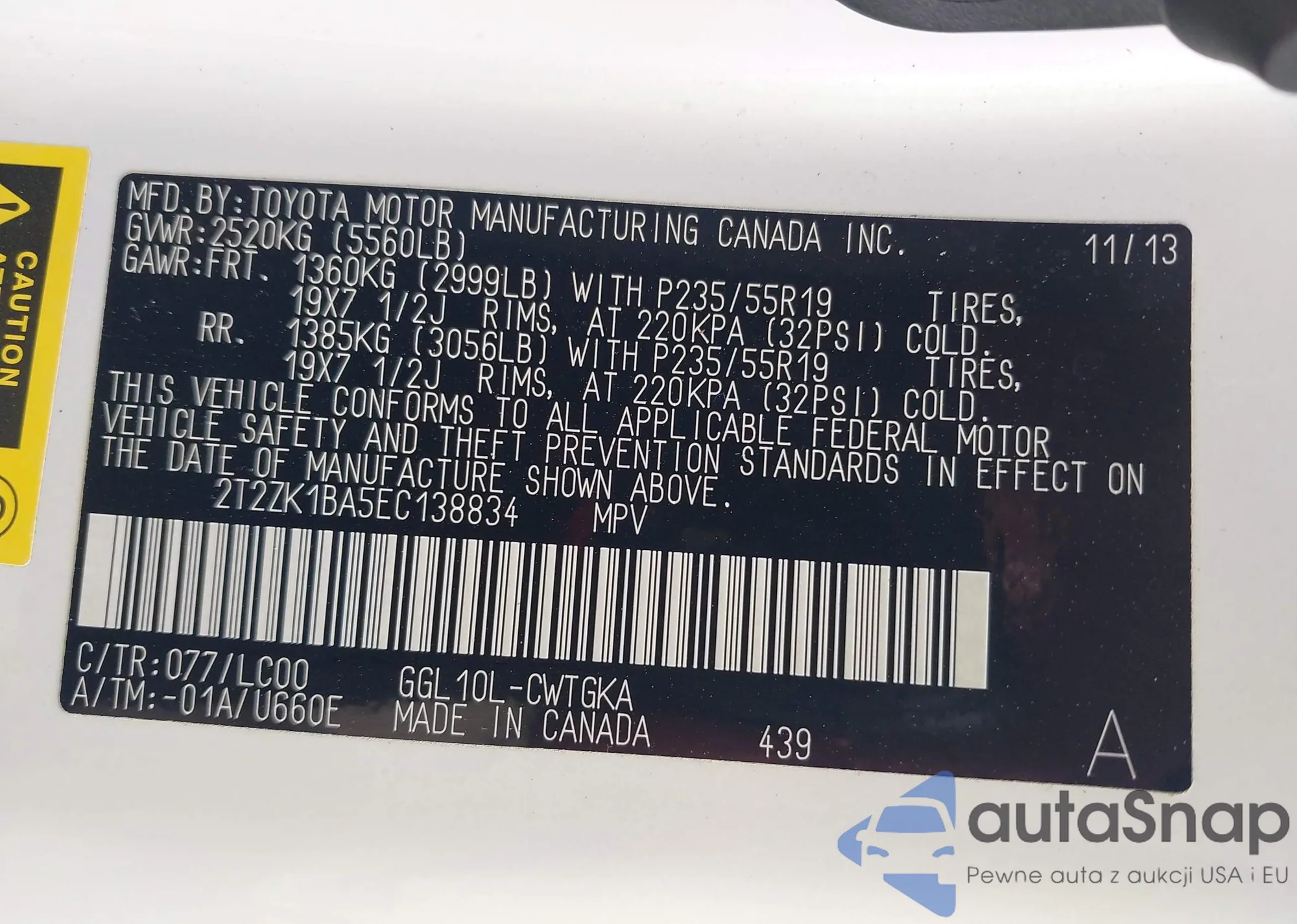 • VIN 2T2ZK1BA5EC138834