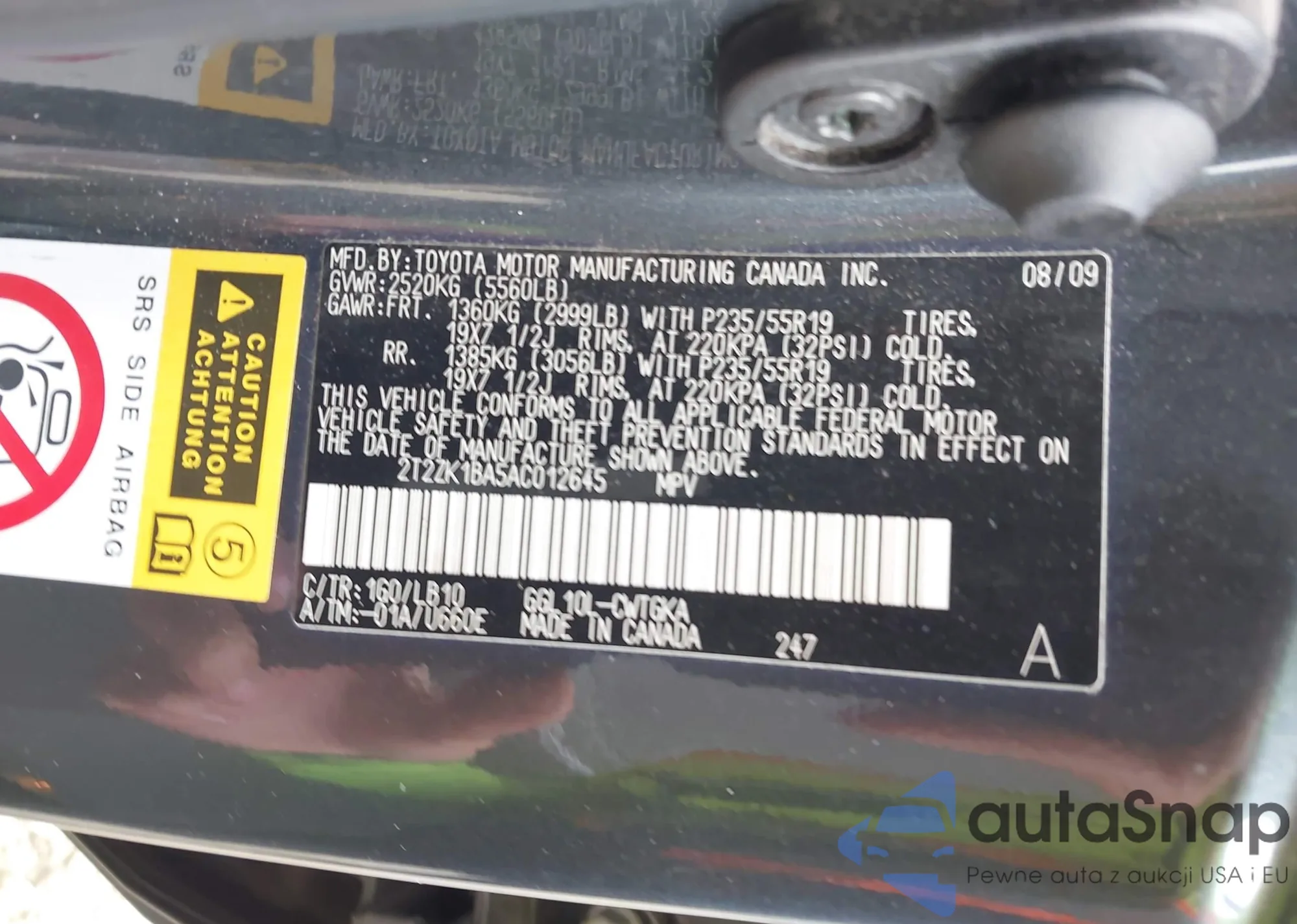 • VIN 2T2ZK1BA5AC012645